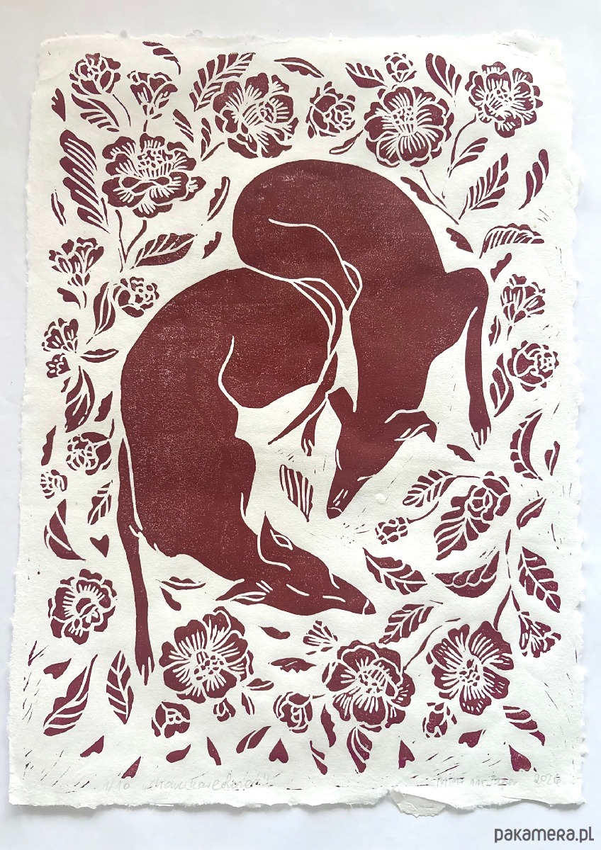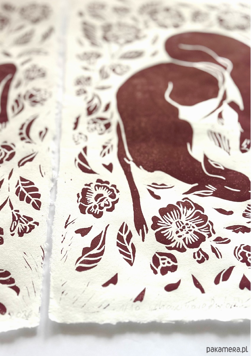 Ręcznie drukowany linoryt na czerpanym papierze Washi w formacie A3 o gramaturze ok 50 g.