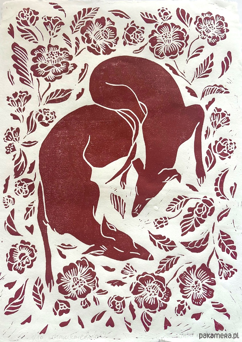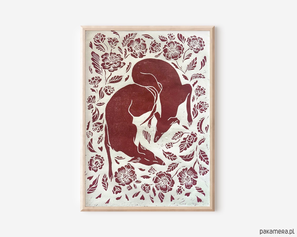 Linoryt przedstawiający dwa charciki w kwiatach będzie idealnym prezentem dla miłośników psów.
