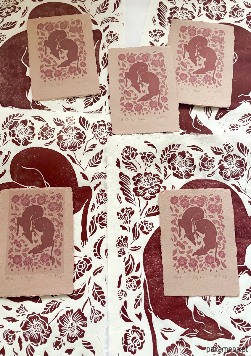 Do każdego linorytu dołączona jest kartka z tym samym wzorem wydrukowanym na papierze czerpanym.