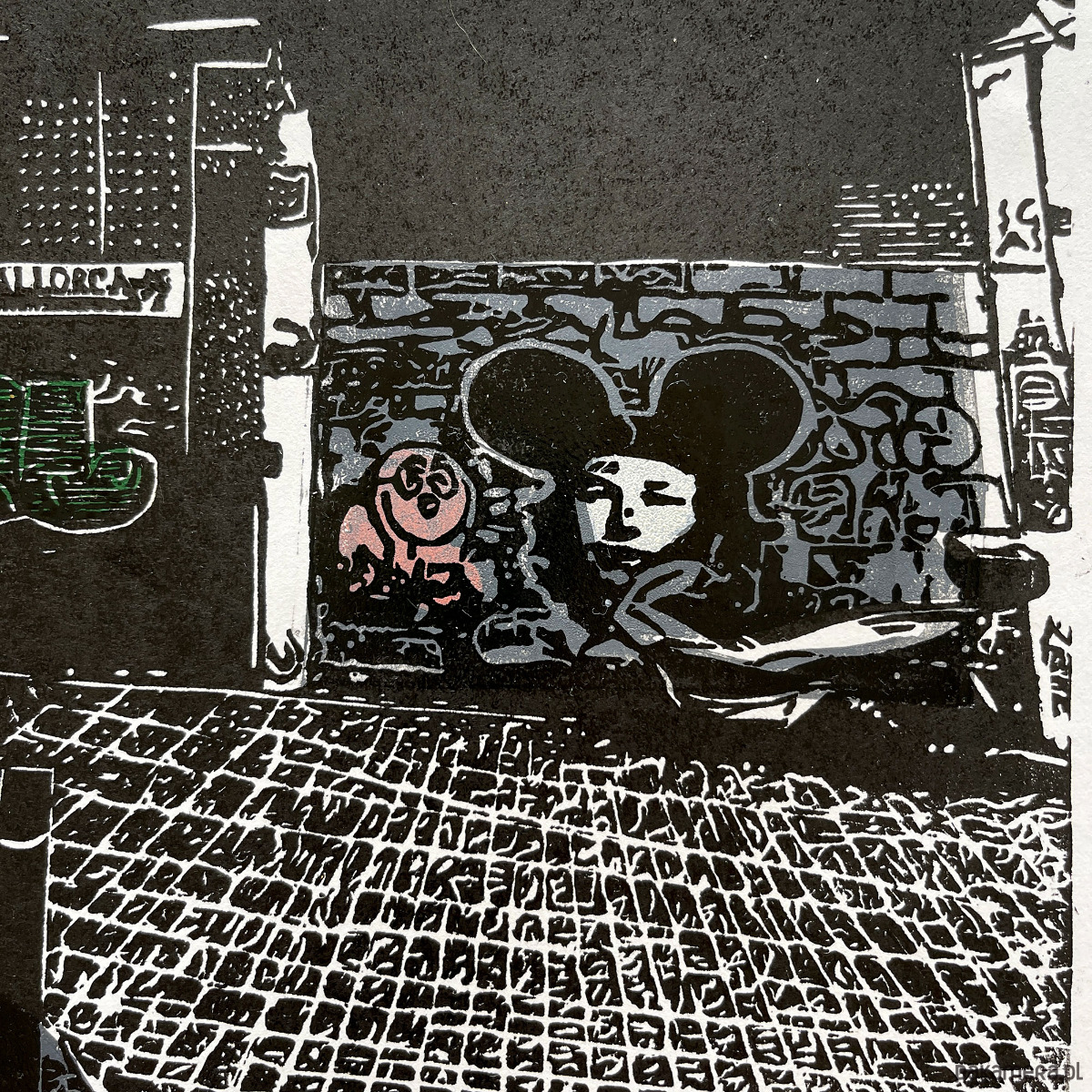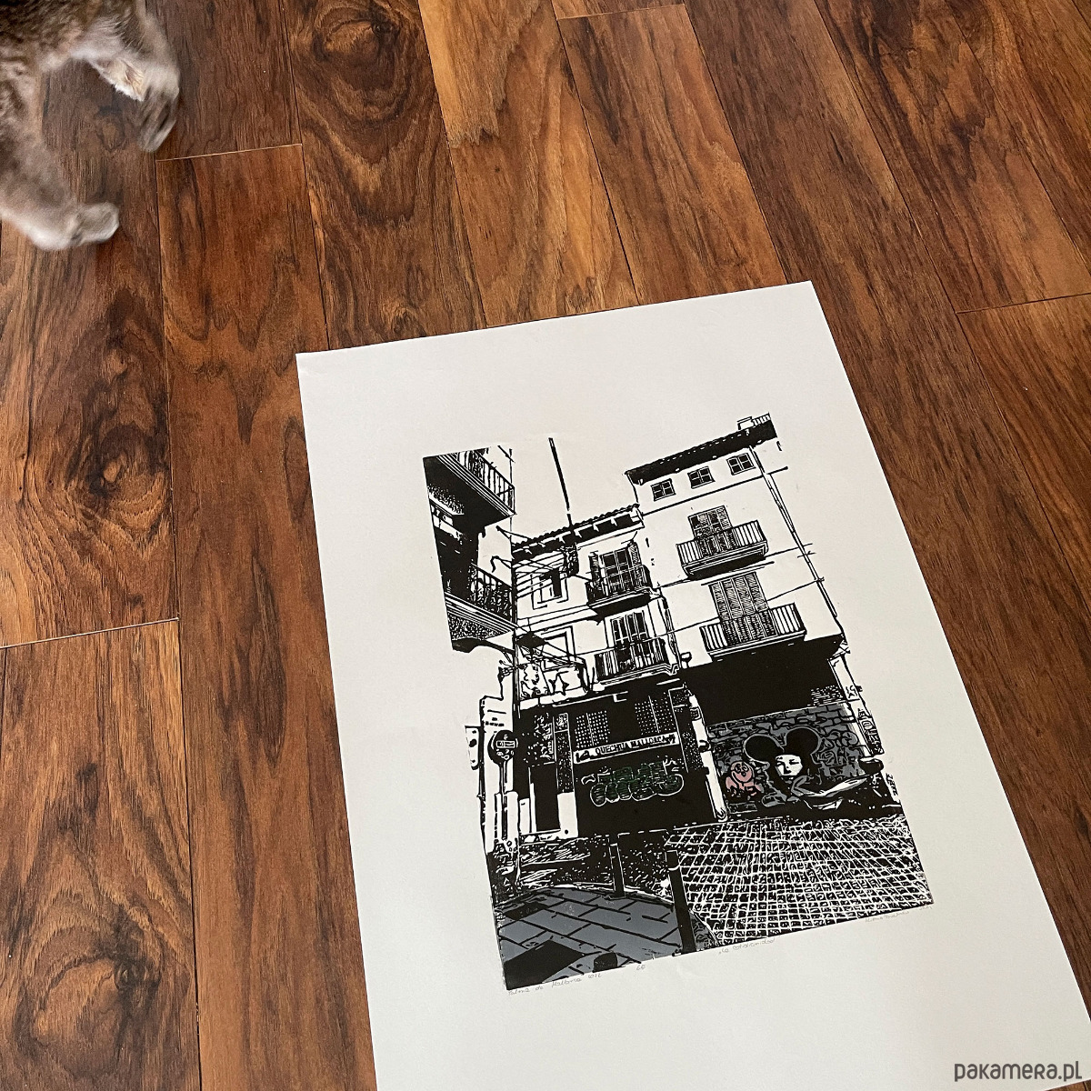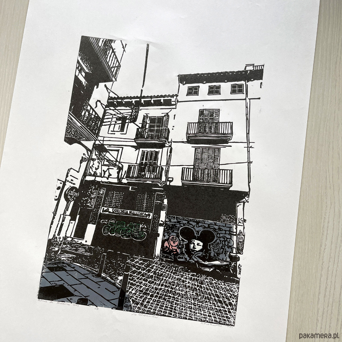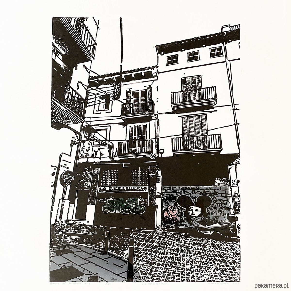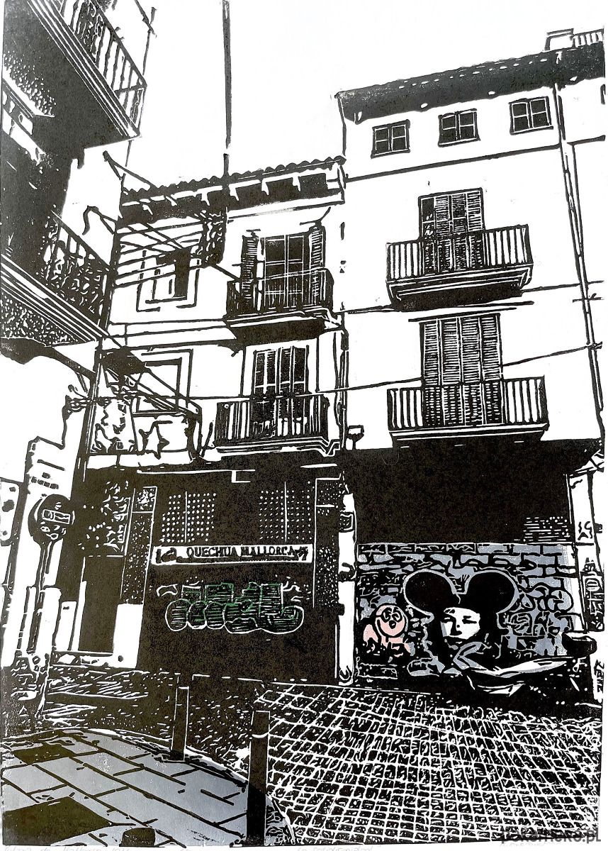 Sama grafika natomiast przedstawia codzienność panującą na jednej z bocznych uliczek w Palmie, na Majorce. Gdzie obok bogactwa, luksusu, turystów z całego świata i wystawnego życia, równolegle trwa to normalne, “prawdziwe”. Gdzie codzienność jest sumą smutków, radości, uśmiechów i łez jej mieszkańców.