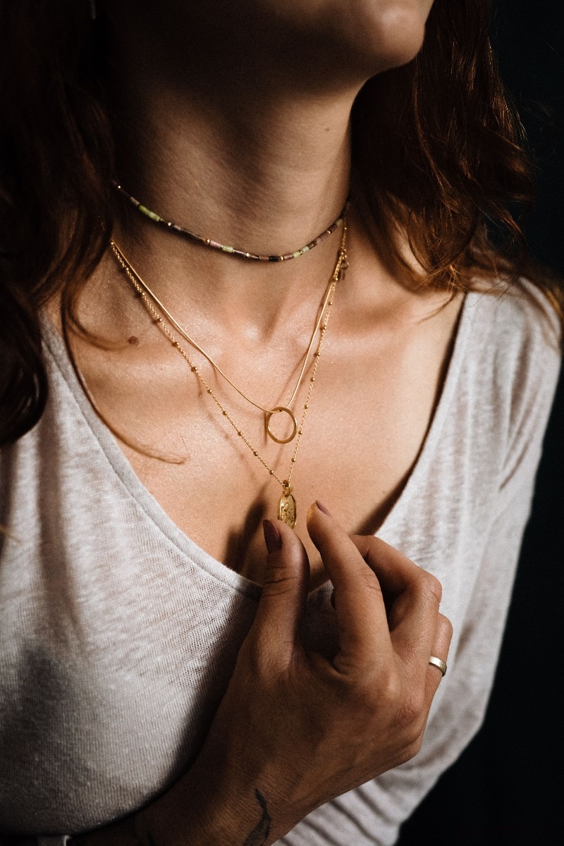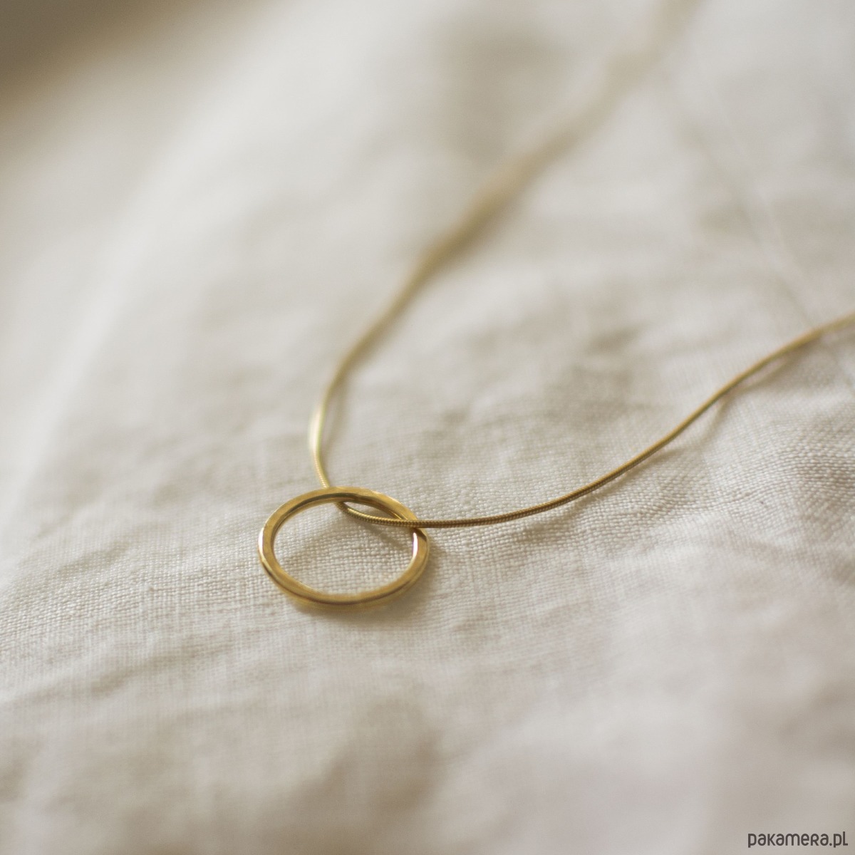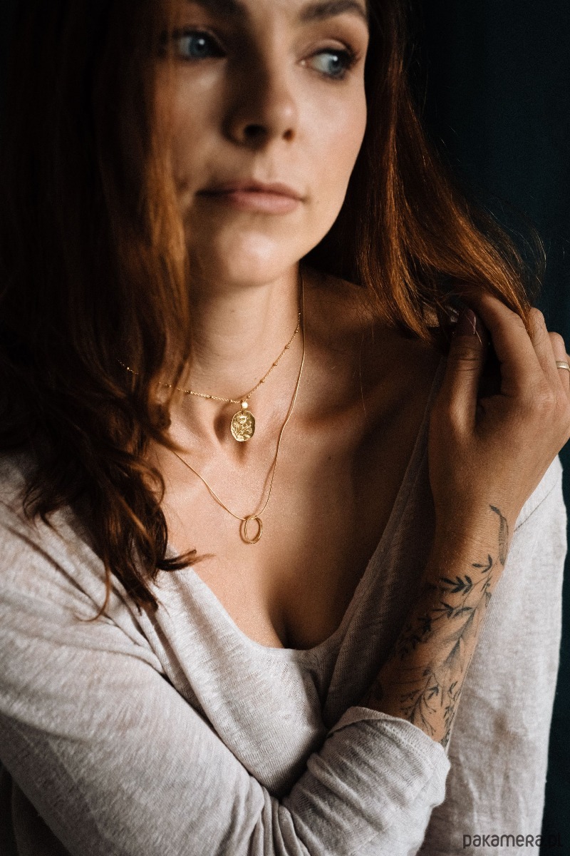 Naszyjnik ZŁOTE KOŁO - koło jest ręcznie młotkowane, co nadaje mu surowej, nieregularnej faktury. Zawieszone jest na aksamitnym łańcuszku typu “wężyk”. Kółko ma średnicę 16 mm. Łańcuszek ma długość 42 cm a przedłużka, to dodatkowe 3,5 cm.