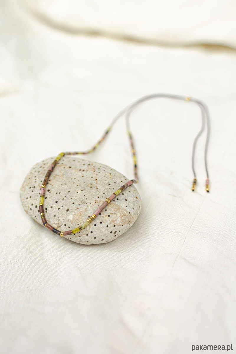 Naszyjnik KWITNĄCA ŁĄKA – w jego skład wchodzą żółte turkusy, różowe rodonity, malutkie złote hematyty. Całość przywodzi na myśl kwitnącą łąkę z delikatnie połyskującymi hematytami. Naszyjnik wkłada się wygodnie przez głowę. Można dowolnie regulować jego długość na szyi od chokera po dłuższy obwód. Zapięcie jest przesuwne, na pozłacaną kuleczkę z sylikonem.