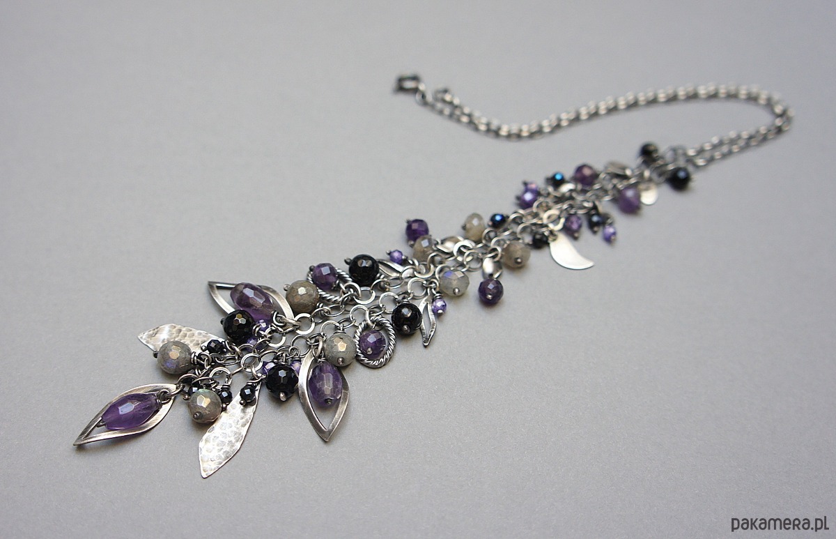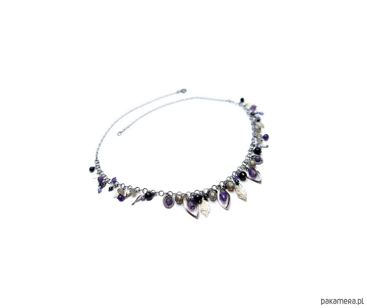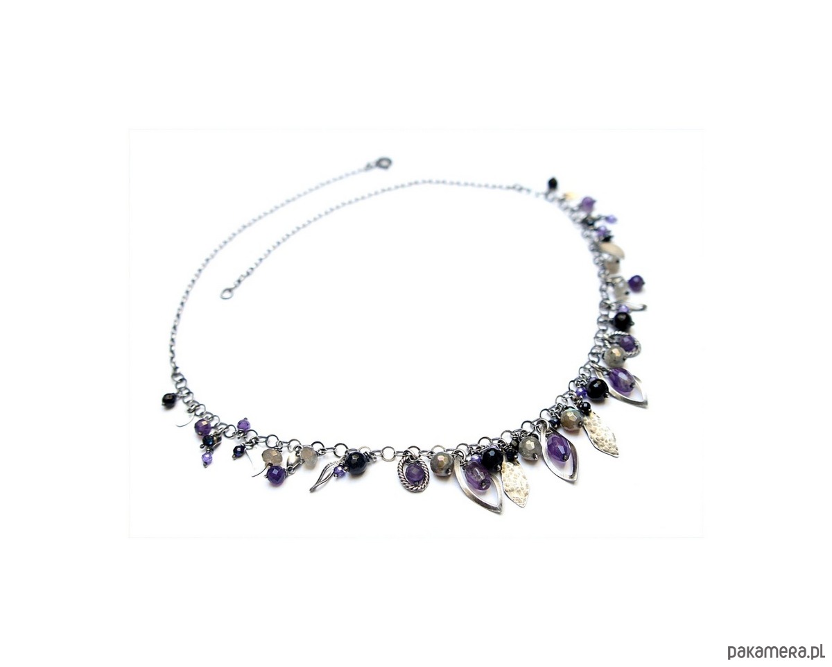Naszyjnik wykonany ze srebra [pr.925] w połączeniu z fasetowanymi kuleczkami labradorytów mystic [6mm], fasetowanymi kuleczkami i oliwkami ametystów [10mm i 4mm], fasetowanymi kuleczkami onyksów [6mm i 4mm], oponkami labradorytów [6mm], fasetowanymi kuleczkami spinelu z efektem mystic [2mm], cyrkoniami [4mm i 3mm] oraz srebrnymi blaszkami. Całość oksydowana i przetarta. Całkowita długość naszyjnika 49cm. Biżuteria ozdobnie zapakowana.