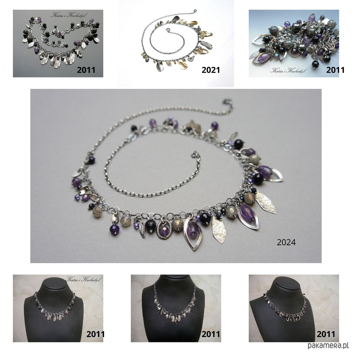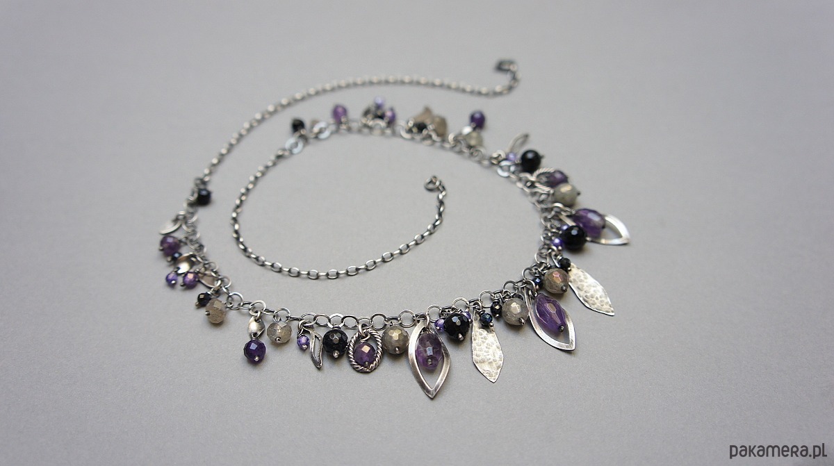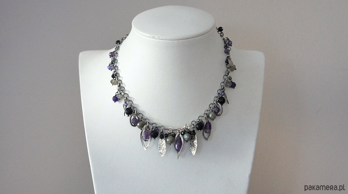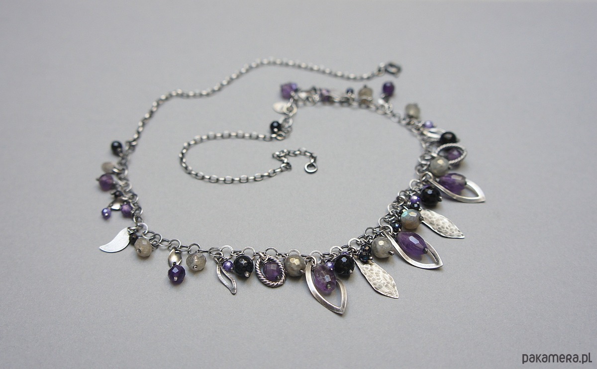 Naszyjnik wykonany ze srebra [pr.925] w połączeniu z fasetowanymi kuleczkami labradorytów mystic [6mm], fasetowanymi kuleczkami i oliwkami ametystów [10mm i 4mm], fasetowanymi kuleczkami onyksów [6mm i 4mm], oponkami labradorytów [6mm], fasetowanymi kuleczkami spinelu z efektem mystic [2mm], cyrkoniami [4mm i 3mm] oraz srebrnymi blaszkami. Całość oksydowana i przetarta. Całkowita długość naszyjnika 49cm. Biżuteria ozdobnie zapakowana.