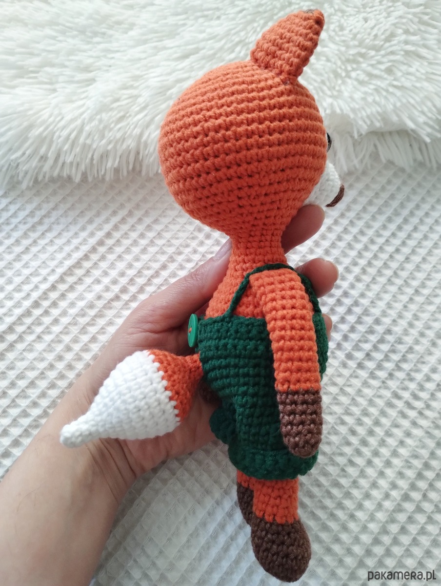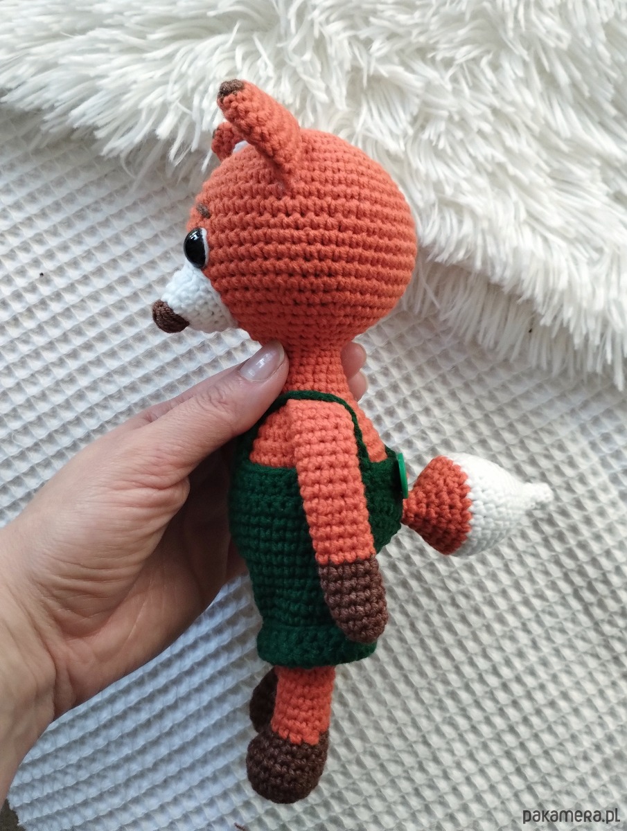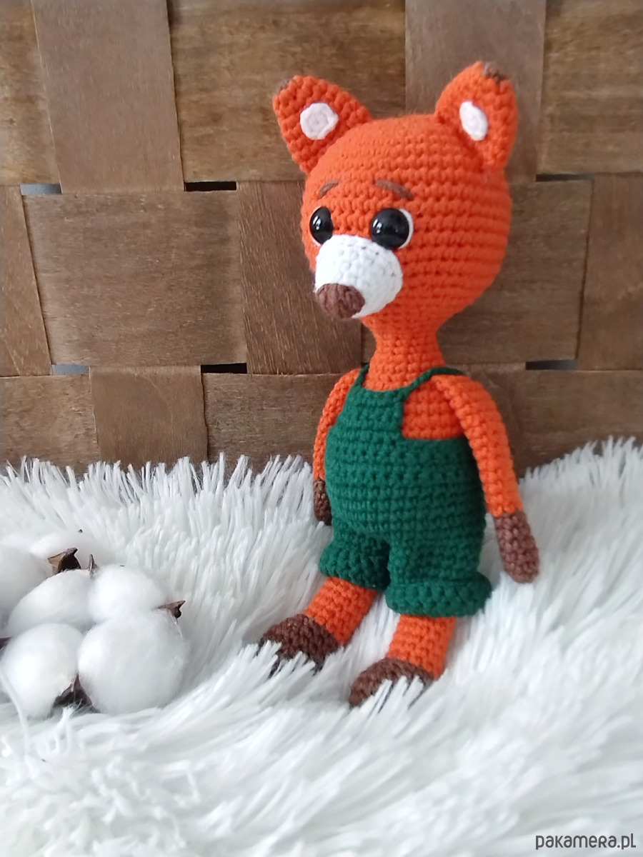 Szydełkowy lis w zdejmowanych spodniach to urocza zabawka dla każdego malucha.
