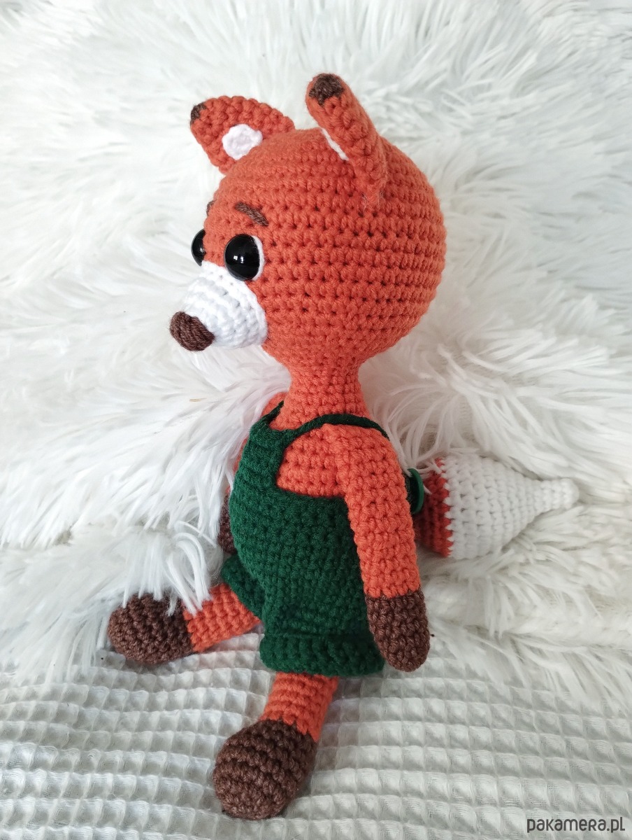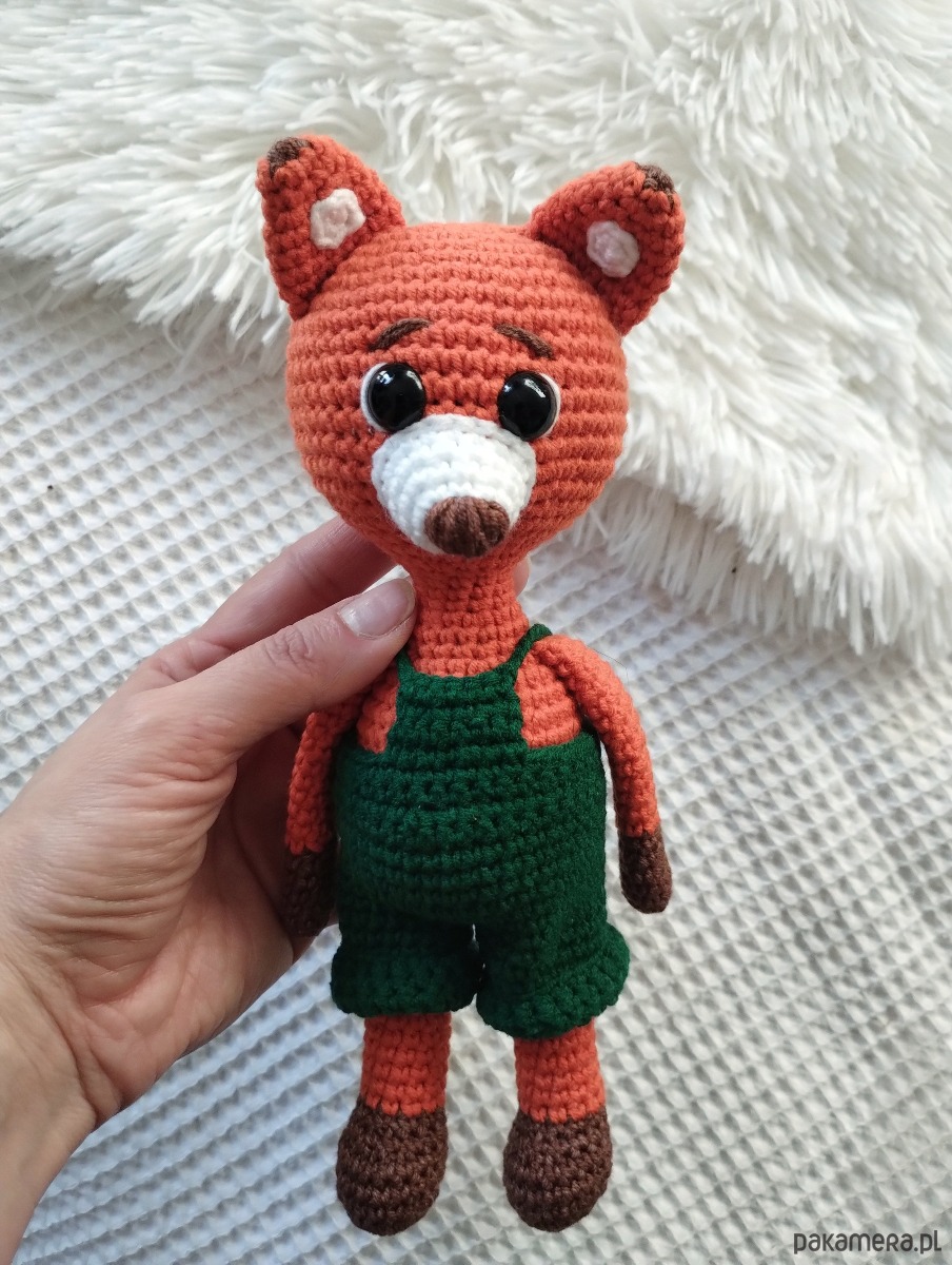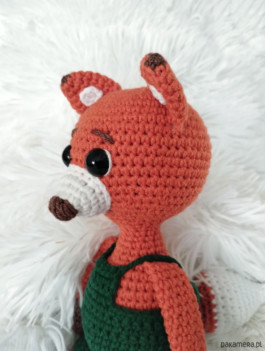 Szydełkowy lis w zdejmowanych spodniach to urocza zabawka dla każdego malucha.