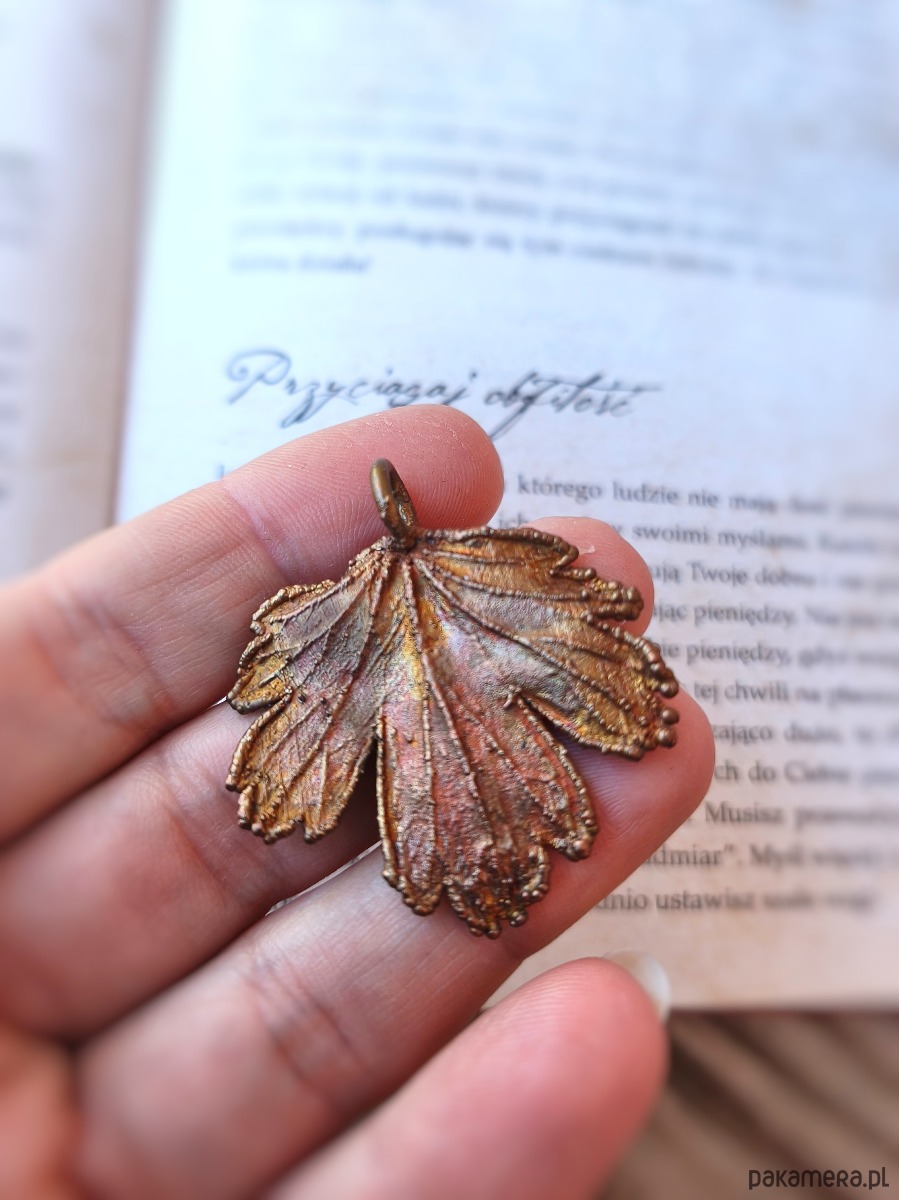 W ten sposób powstał efektowny amulet natury — prawdziwy liść zachowany w miedzi, przekształcony w wyjątkowy, jedyny w swoim rodzaju wisiorek. Każdy egzemplarz zachowuje indywidualny kształt i rysunek, dzięki czemu jest niepowtarzalnym zapisem przyrody.