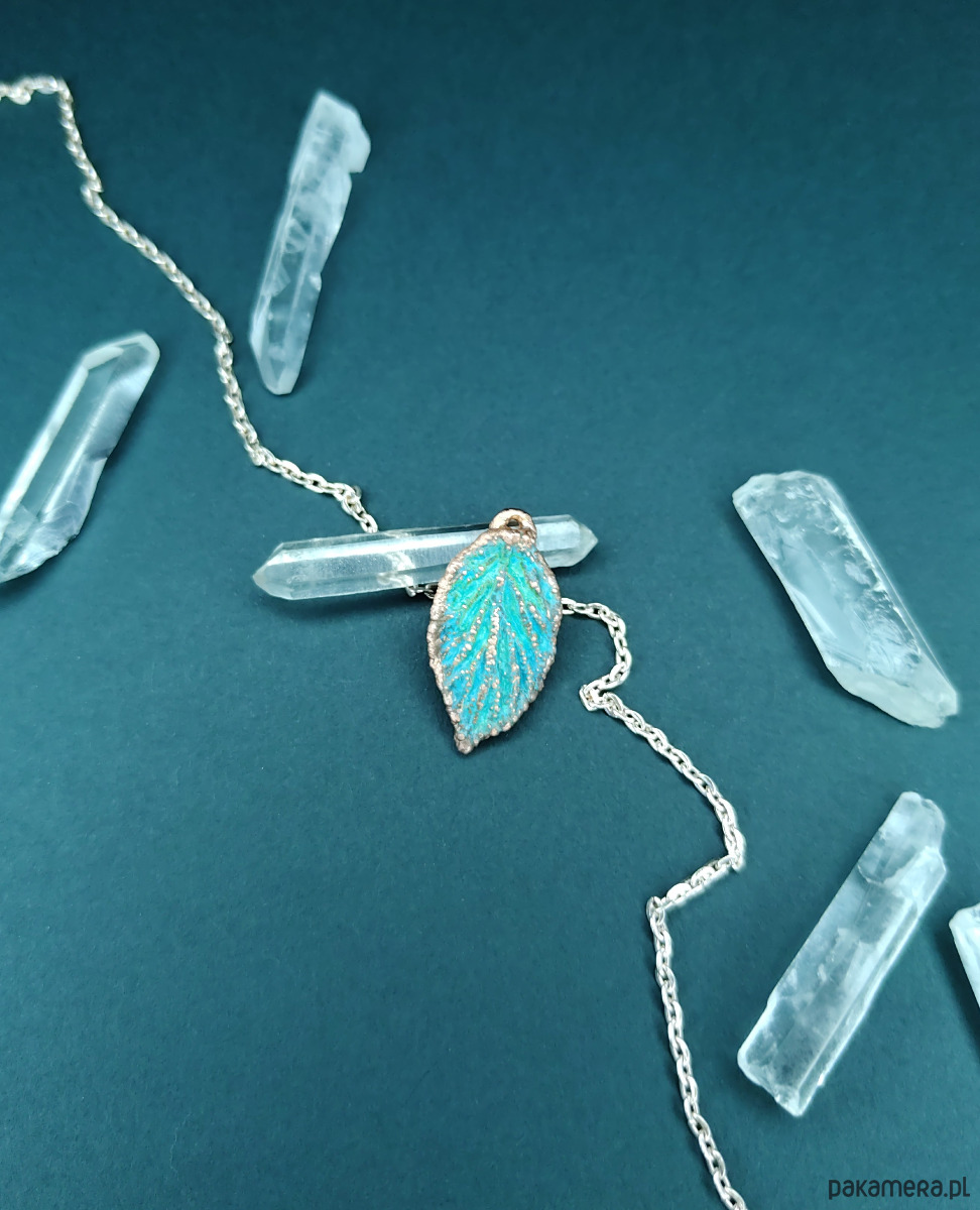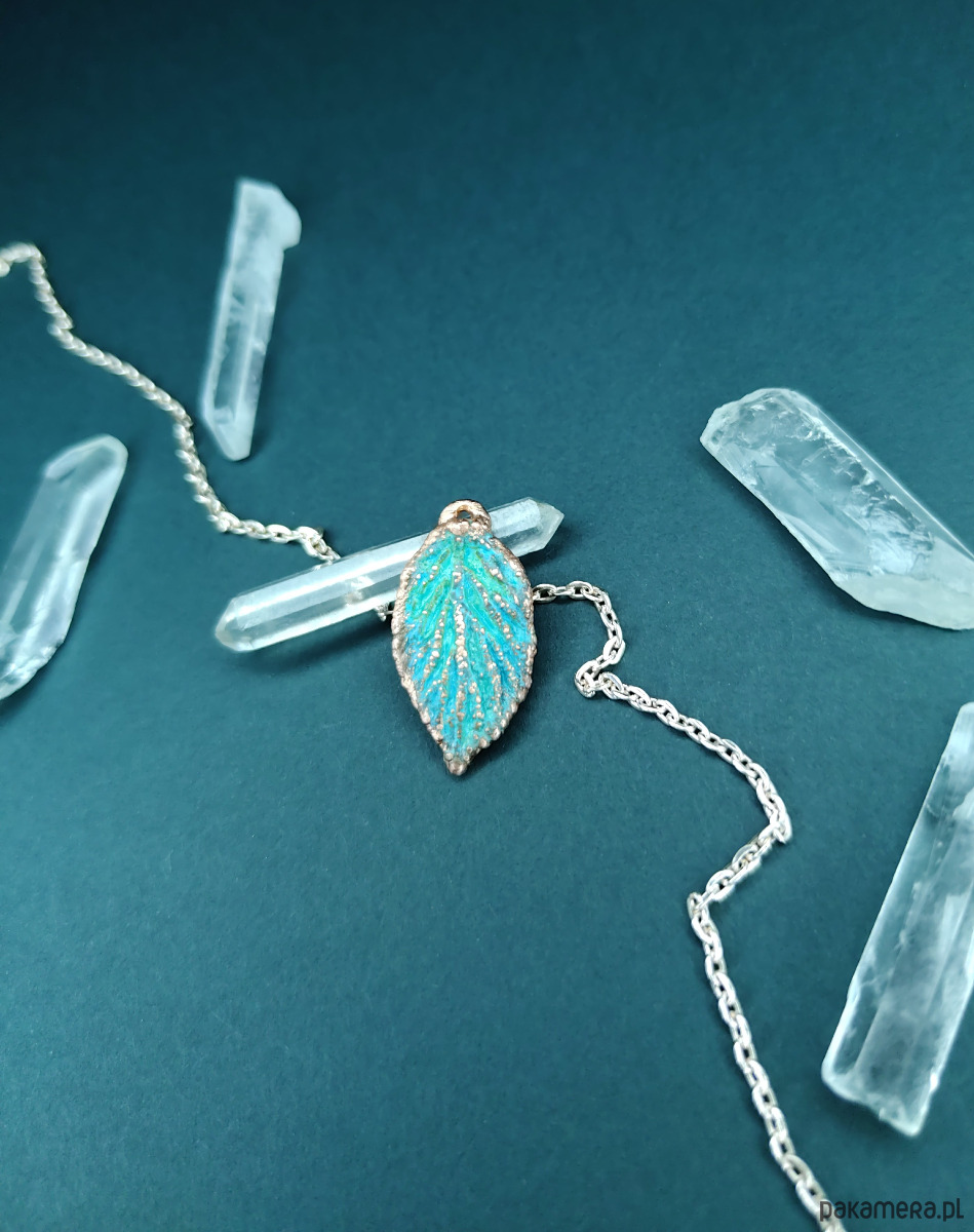 Mały listek kaliny olcholistnej w turkusowej patynie talizman opieki i ochrony