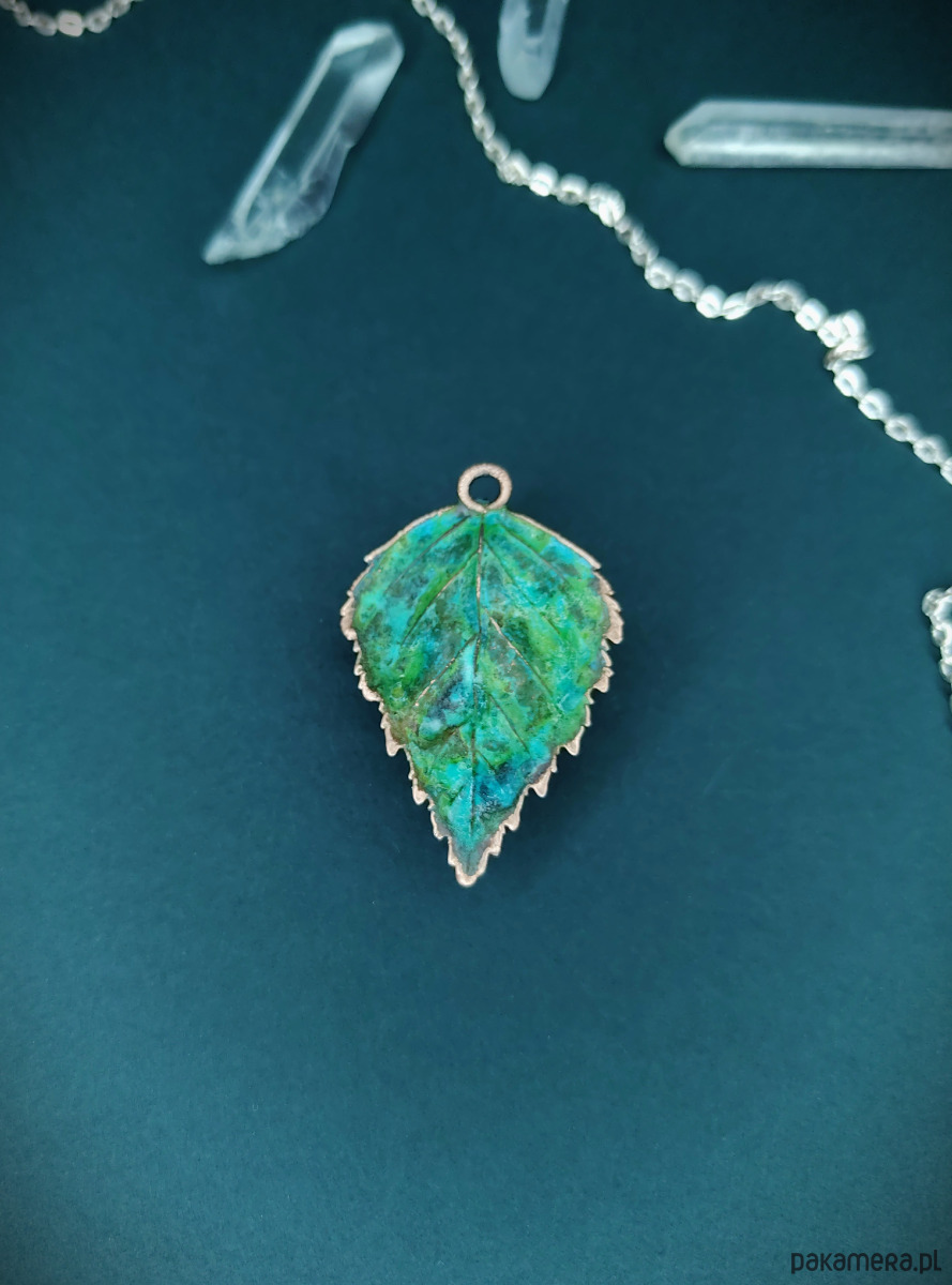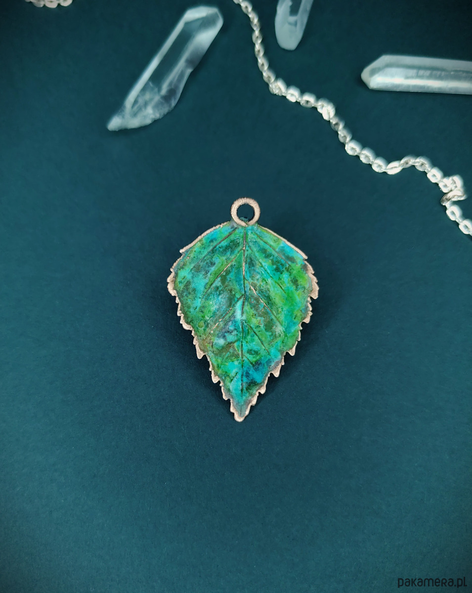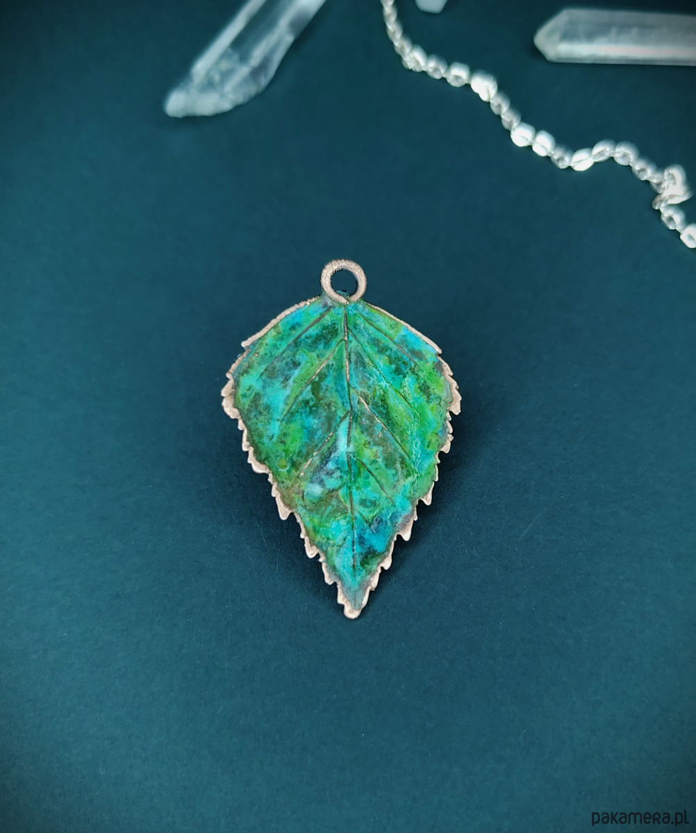 Prawdziwy liść brzozy został pokryty miedzią i ozdobiony zielono- turkusową patyną, której kolory przywodzą kojącą energię lasu. Patyna podkreśla misterność naturalnego kształtu, a ręczne wykonanie sprawia, że każdy egzemplarz jest jedyny w swoim rodzaju.