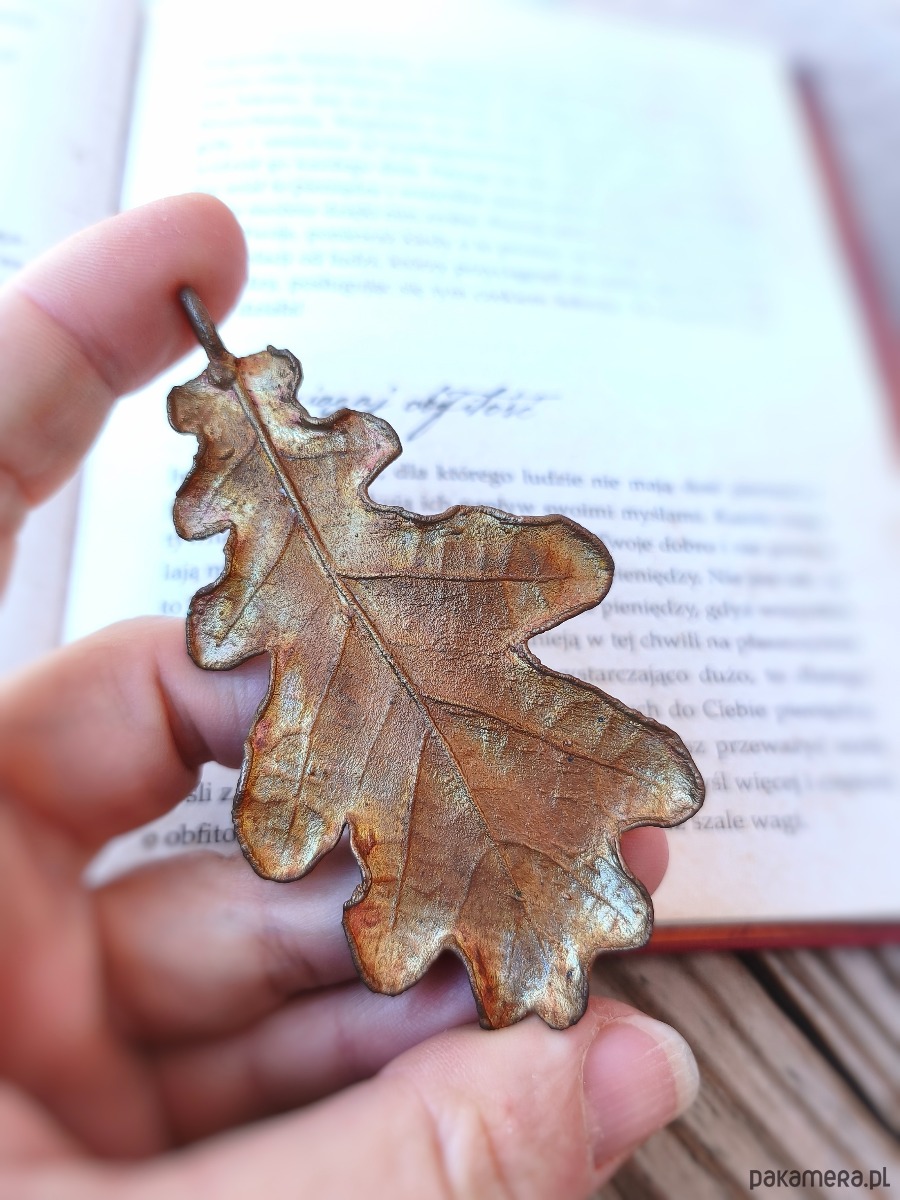 Ten wisiorek powstał z prawdziwego liścia dębu, zebranego i spreparowanego w pełni lata, aby pod miedzianą skorupką zachować jego naturalną strukturę i rysunek żyłek. Każdy egzemplarz jest pojedynczym, unikatowym odciskiem przyrody – natura nie tworzy dwóch identycznych liści.