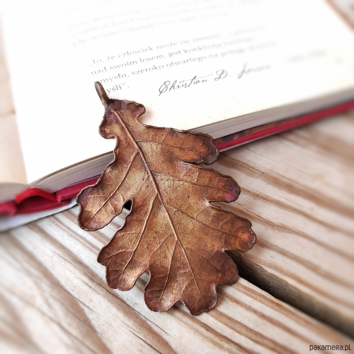 Liść dębu w miedzi to odcisk przyrody wykonany w pojedynczym unikatowym egzemplarzu.