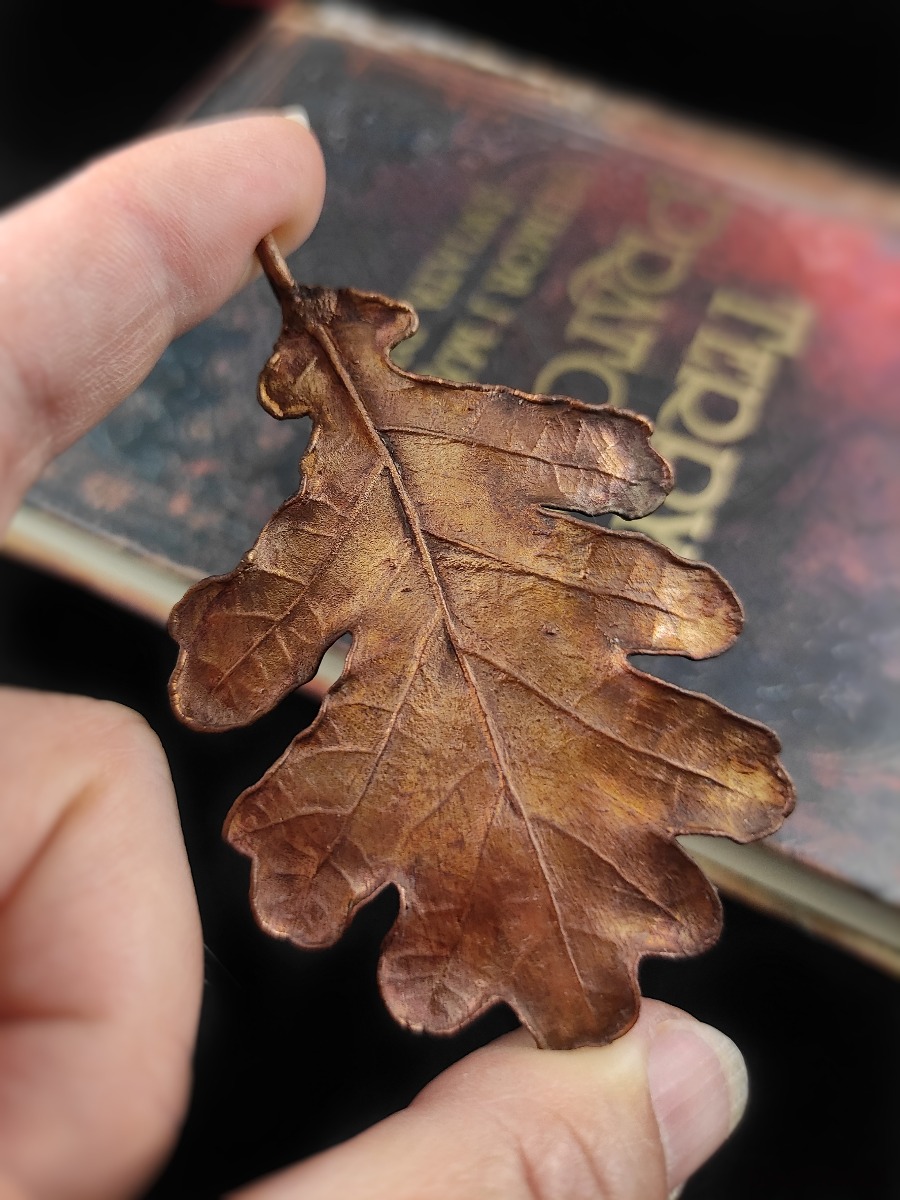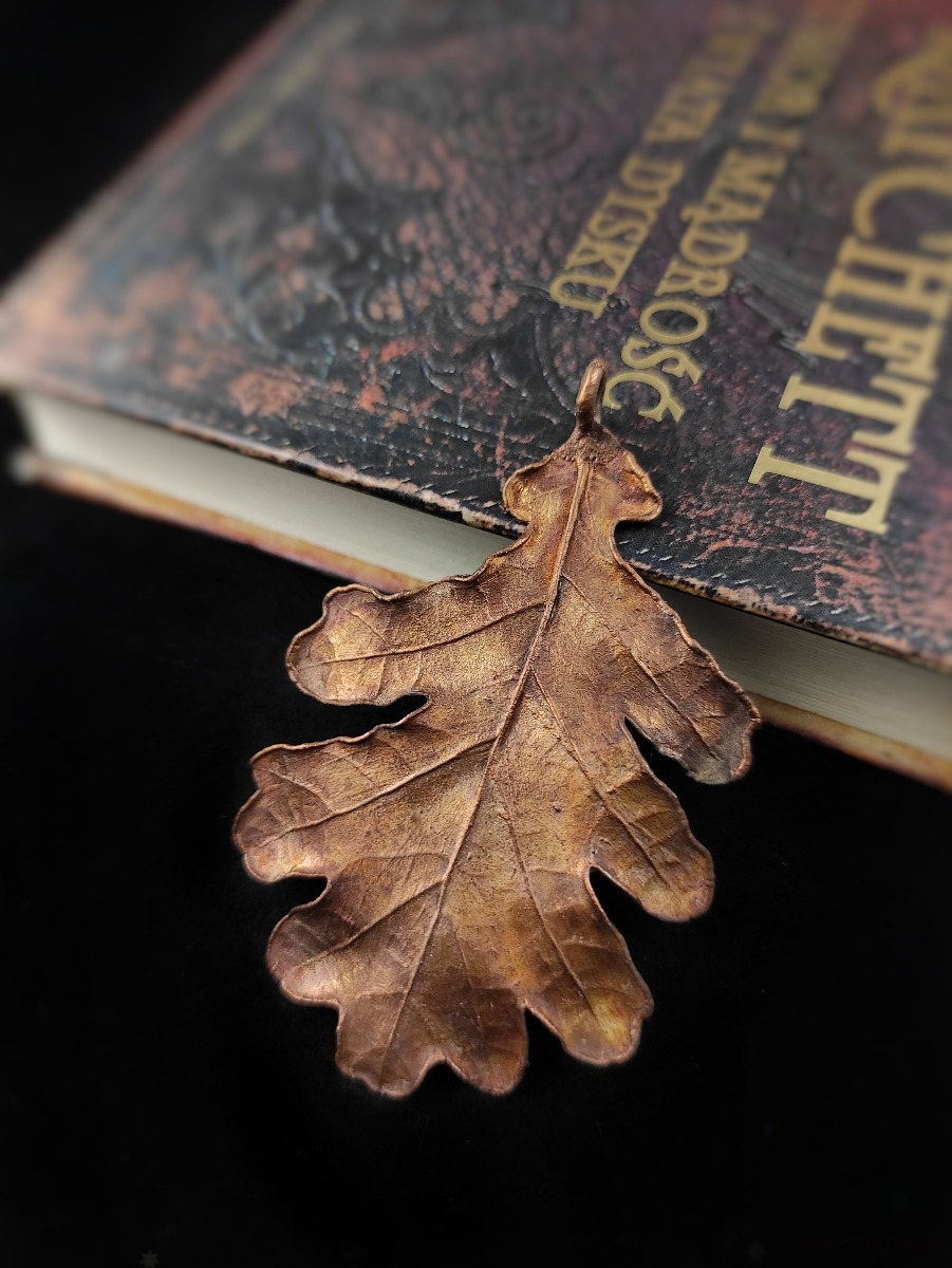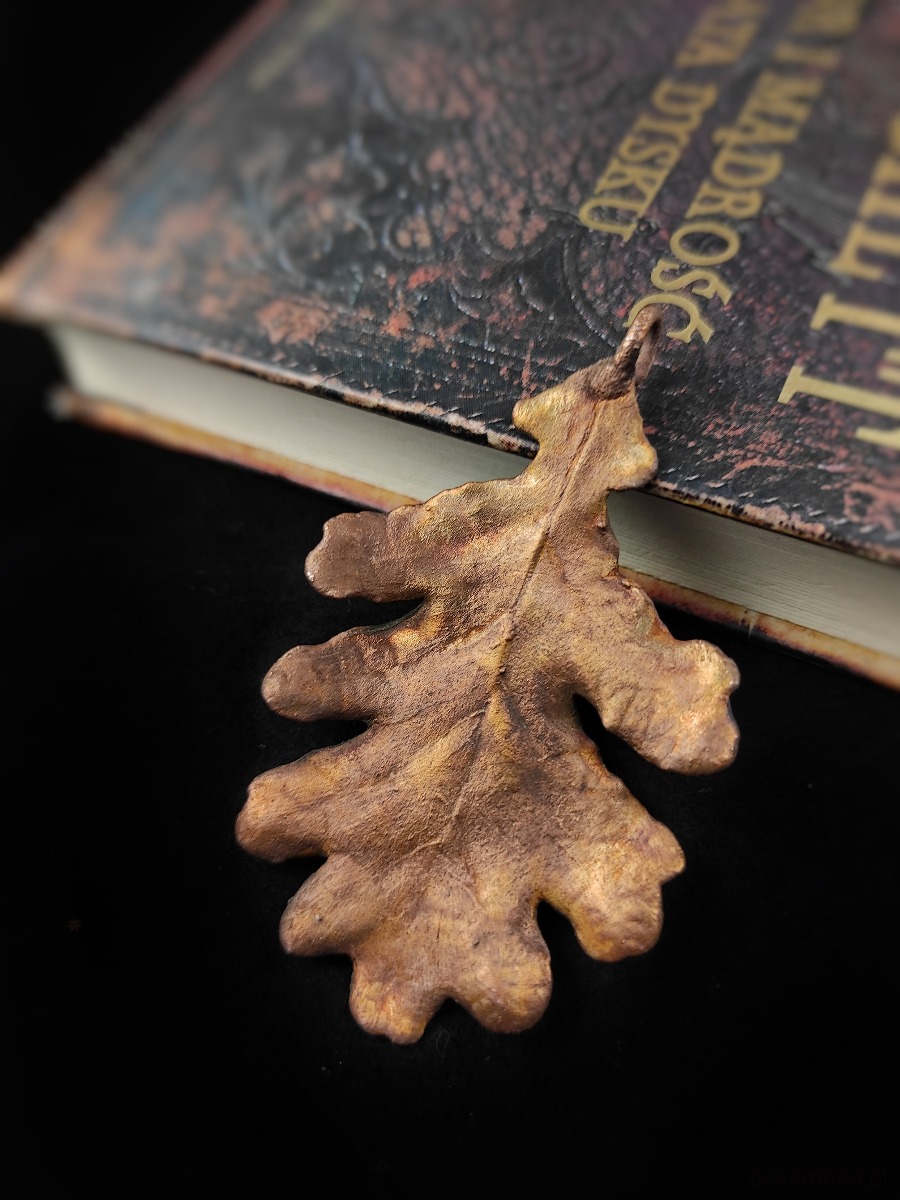 Liść dębu zebraliśmy i spreparowalismy w pełni lata, aby pod miedzianą skorupką zamknąć go na wieki jako amulet mocy.