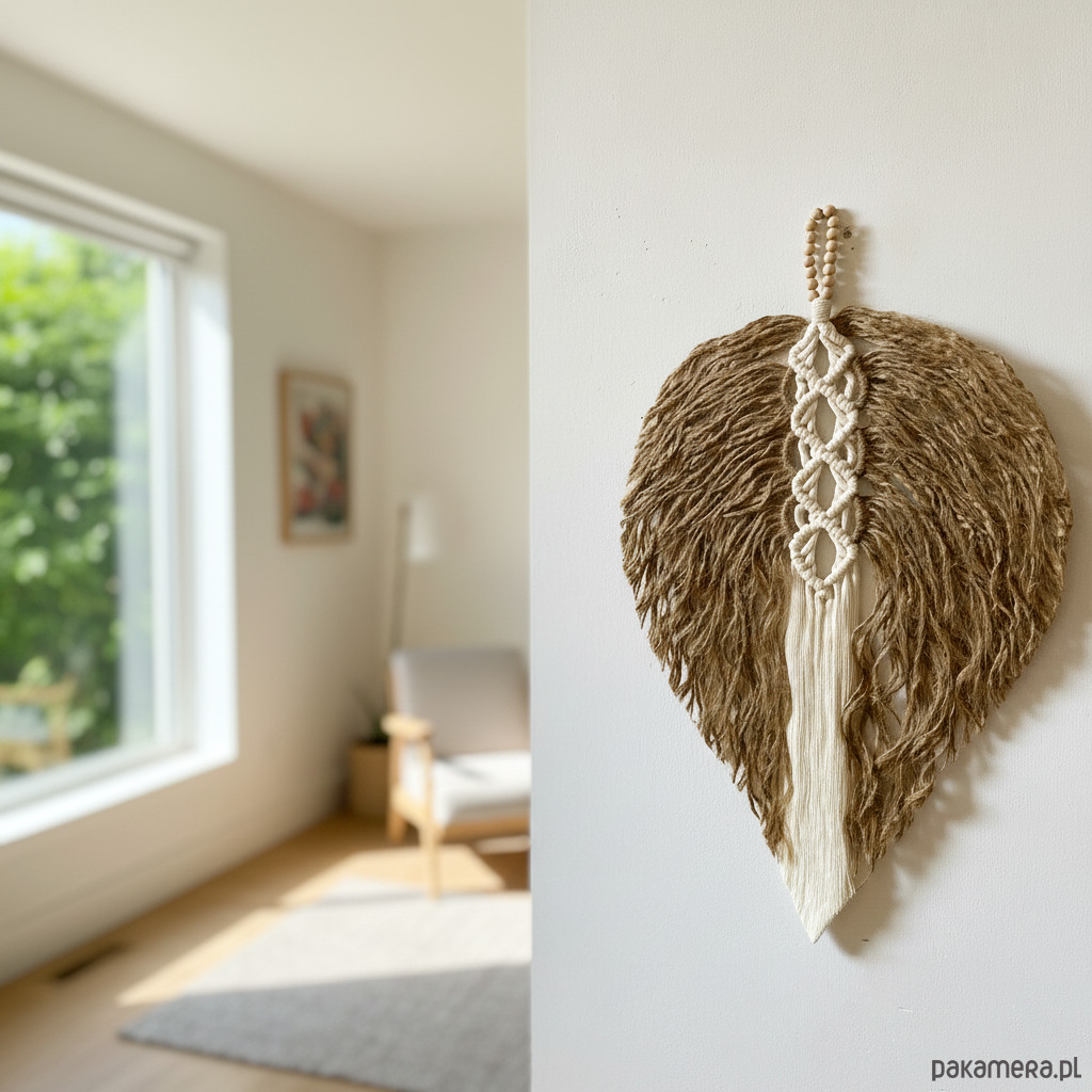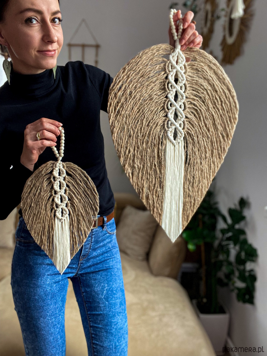Zawieszka liść wykonana techniką makramy ze sznurka bawełnianego, skręcanego o grubości 5 mm oraz sznurka jutowego. Zawieszka jest usztywniona, wystabilizowana i utrwalona. Nie trzeba jej czesać ani układać. Zachowuje swój kształt i stanowi trwałą dekorację.