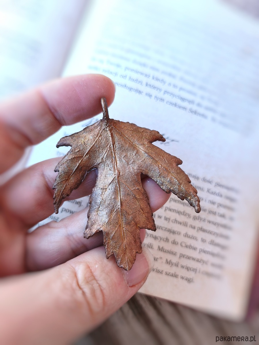 Ten wyjątkowy wisior powstał z prawdziwego liścia czerwonego klonu, który został utrwalony w miedzi przy użyciu techniki galwanizacji. Każda żyłka, naturalne wcięcie i linia liścia zostały wiernie zachowane, dzięki czemu biżuteria zachwyca autentycznością i organicznym pięknem.