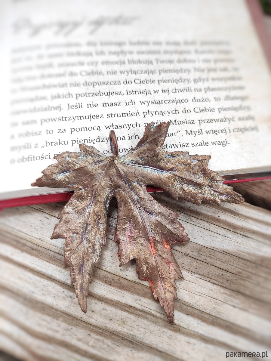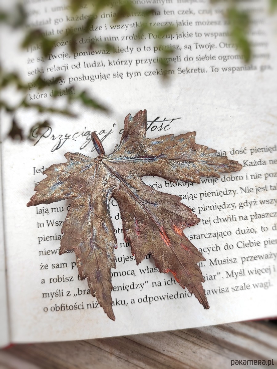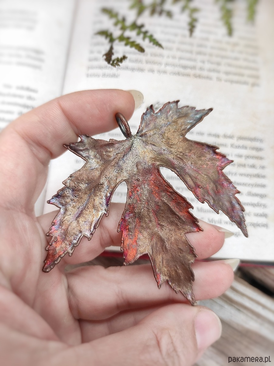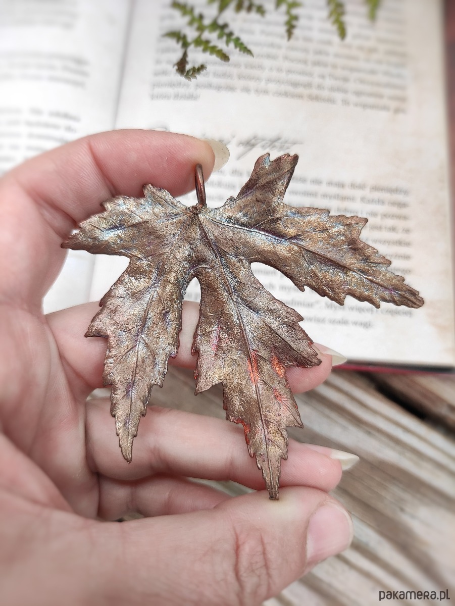 Naturalny liść klonu srebrzystego, zebrany w pełni lata pokryliśmy warstwą miedzi za pomocą procesu galwanizacji
