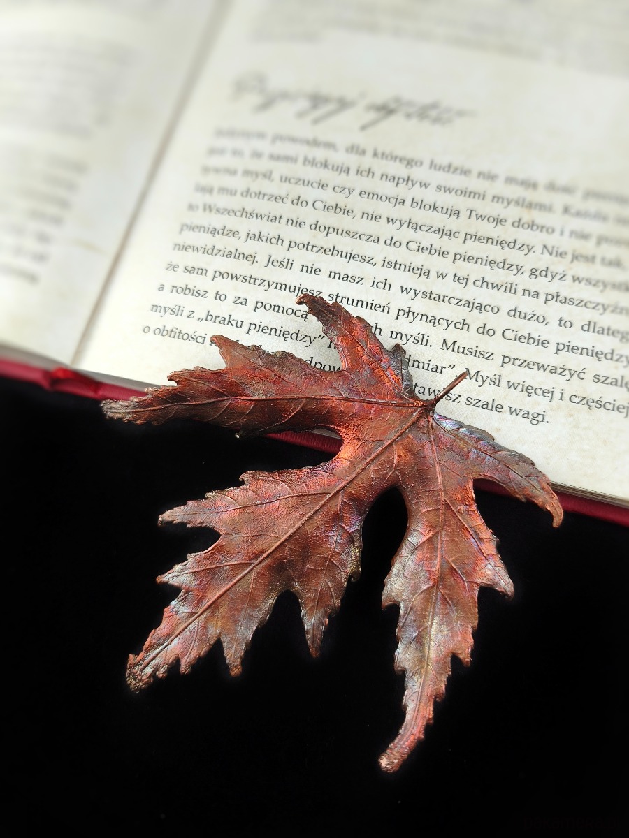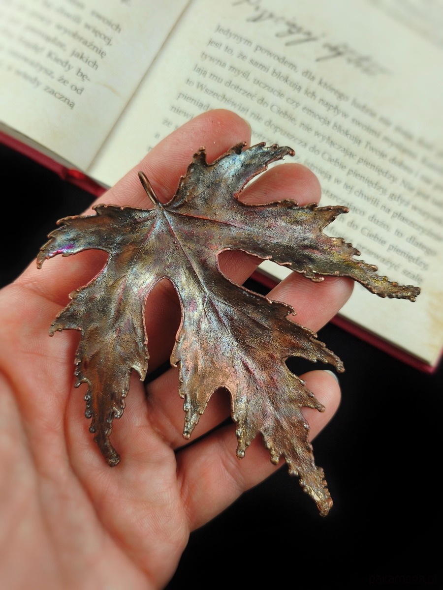 Naturalny liść klonu srebrzystego, zebrany w pełni lata pokryliśmy warstwą miedzi za pomocą procesu galwanizacji