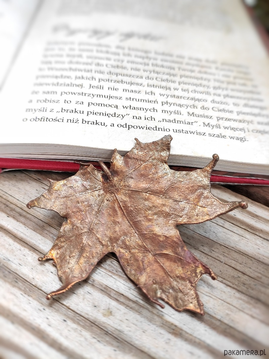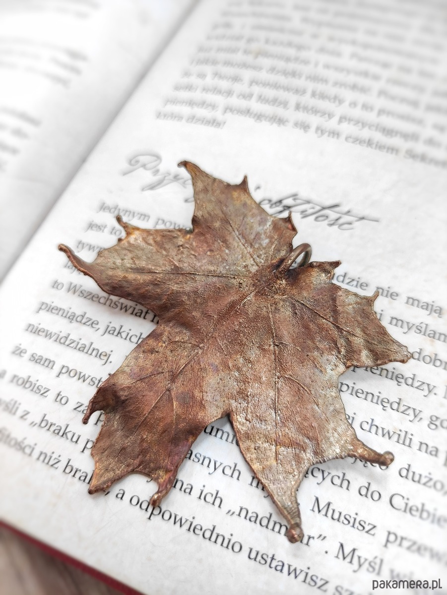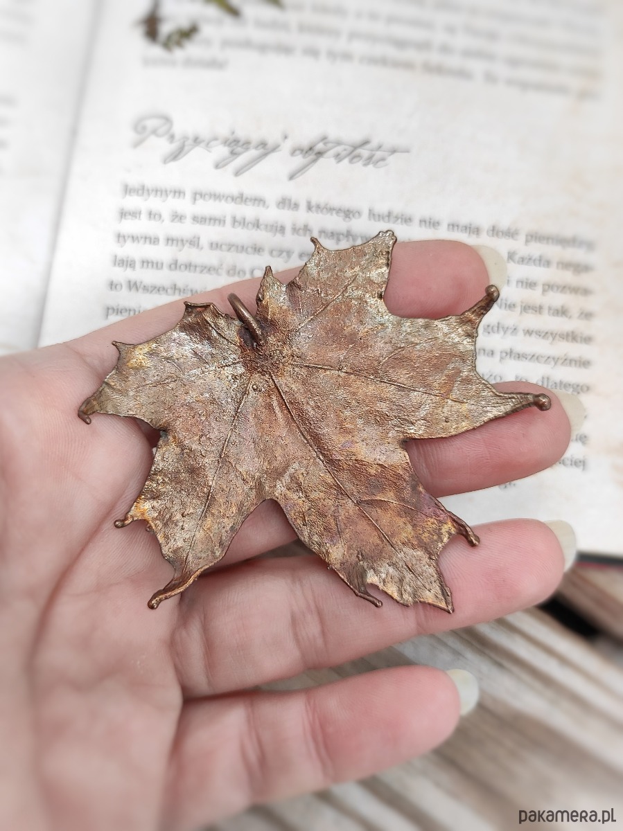 Naturalny liść klonu, zebrany w pełni lata pokryliśmy warstwą miedzi za pomocą procesu galwanizacji