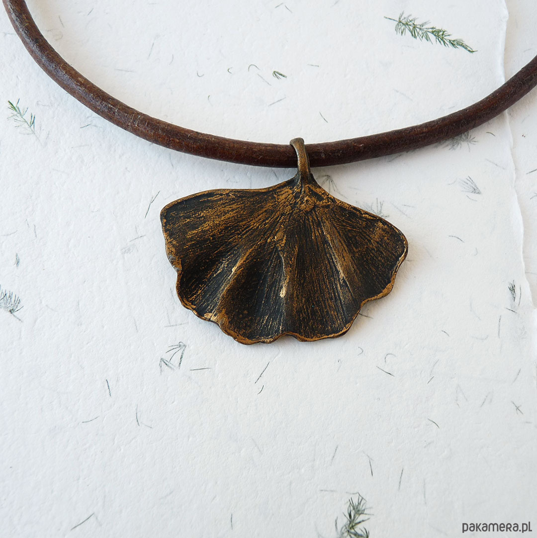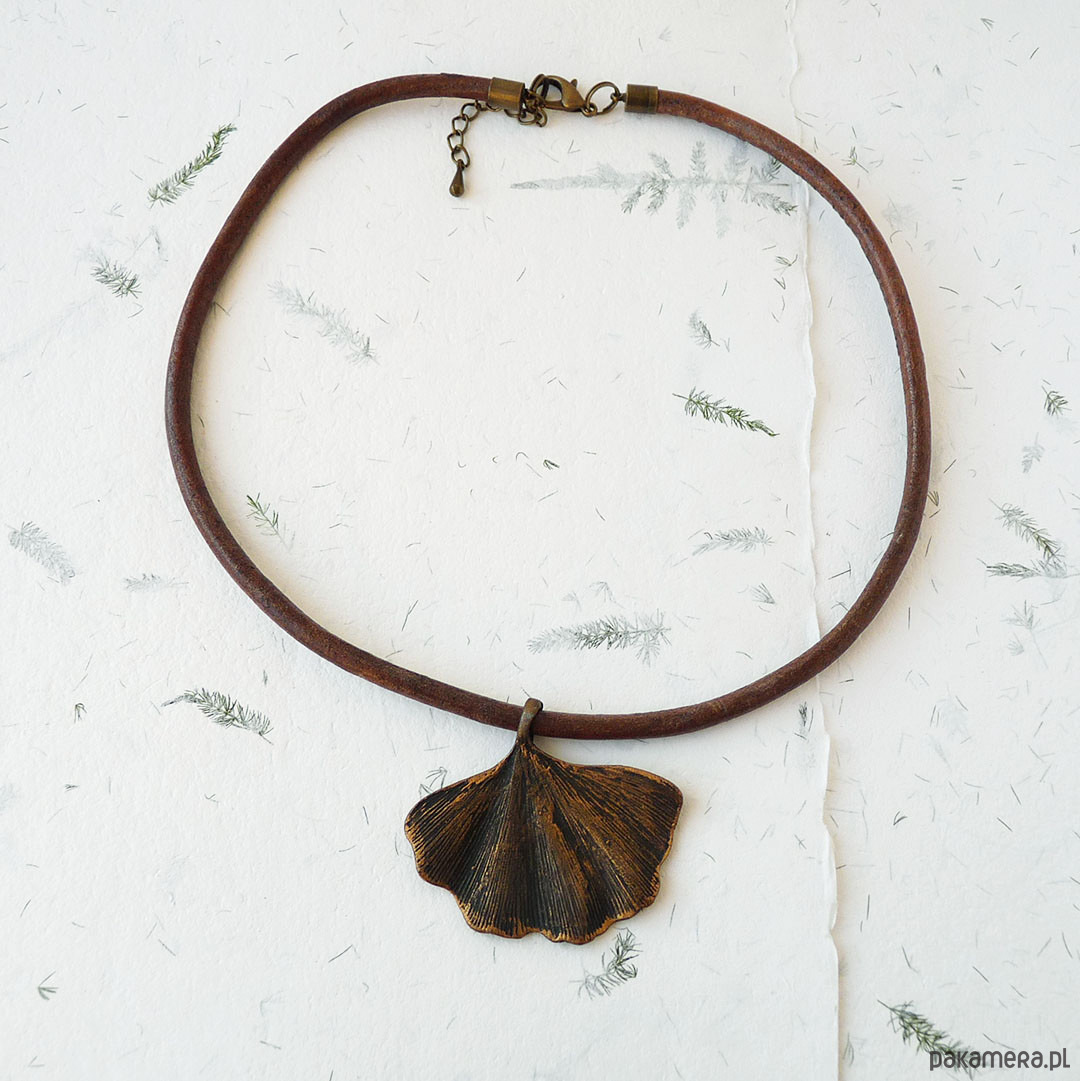 Stylowy naszyjnik z metalową zawieszką w kształcie liścia miłorzębu na solidnym rzemieniu