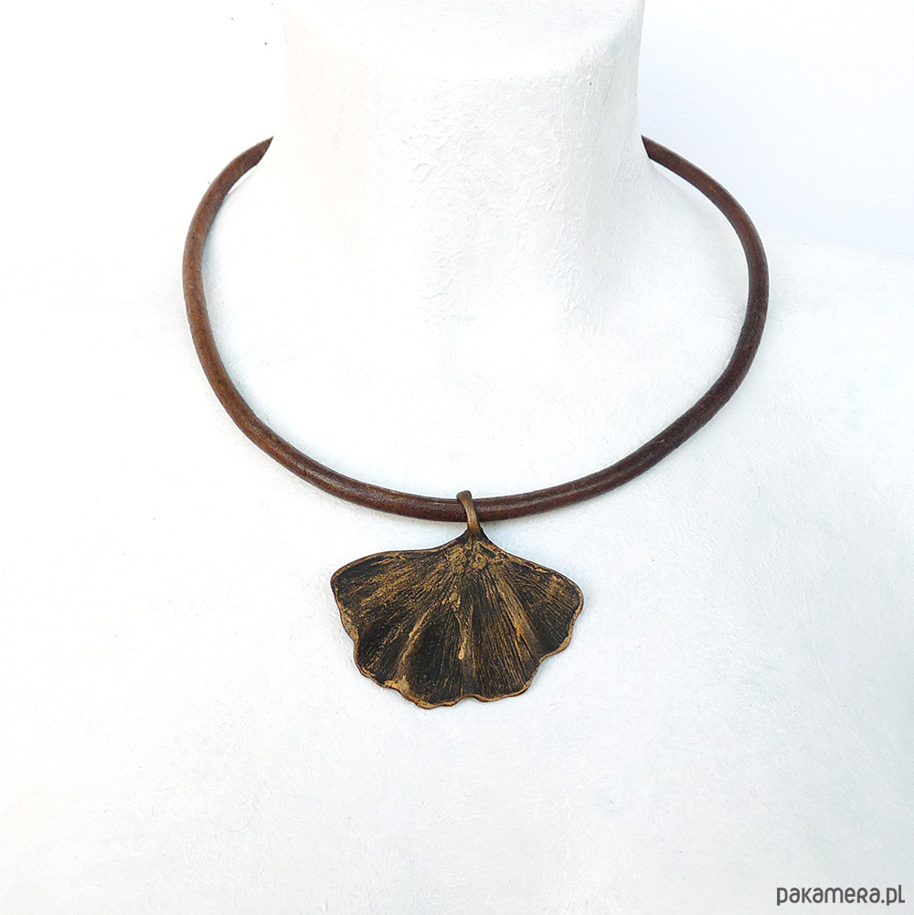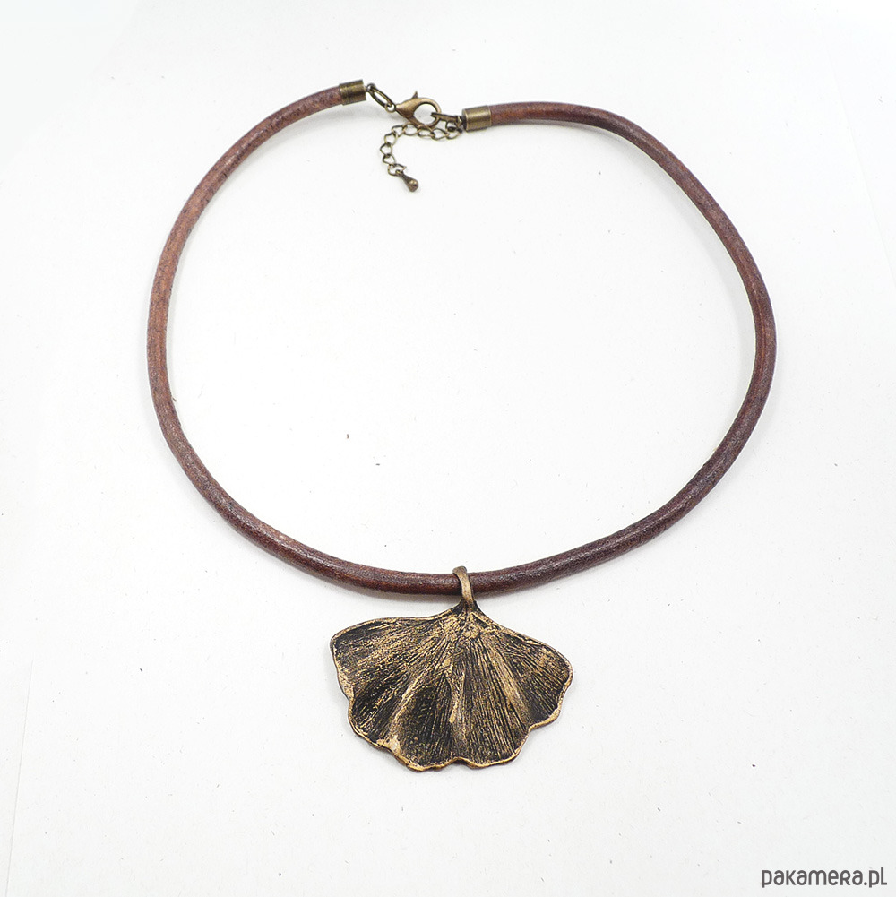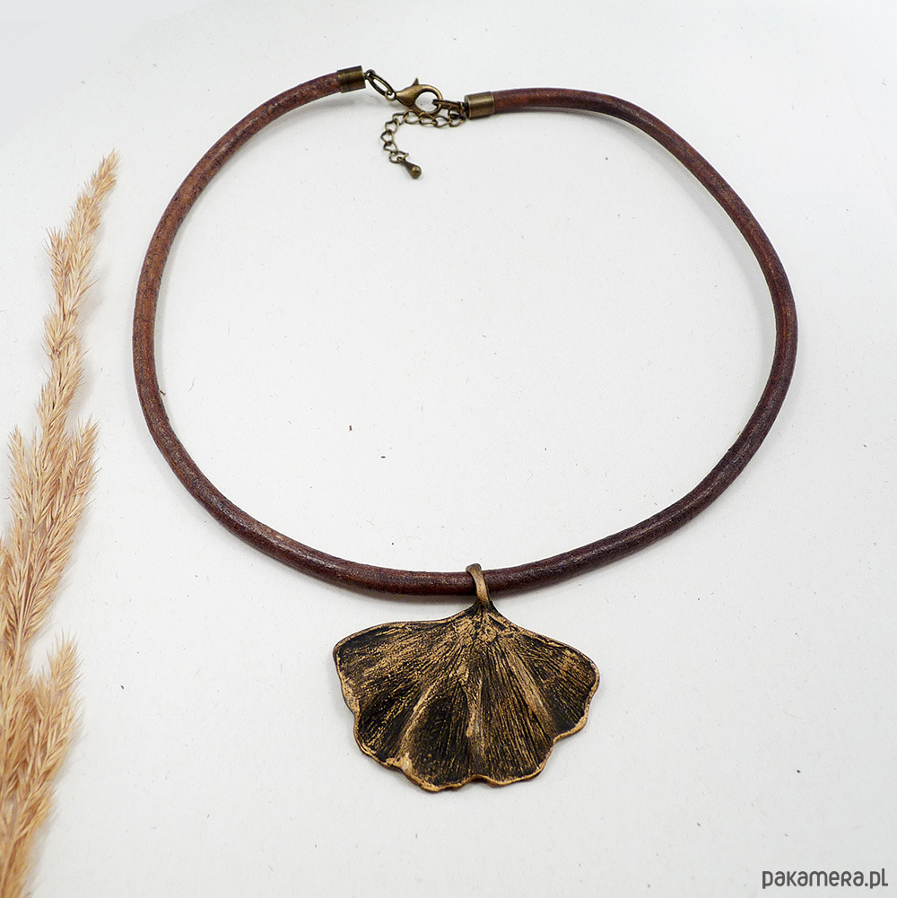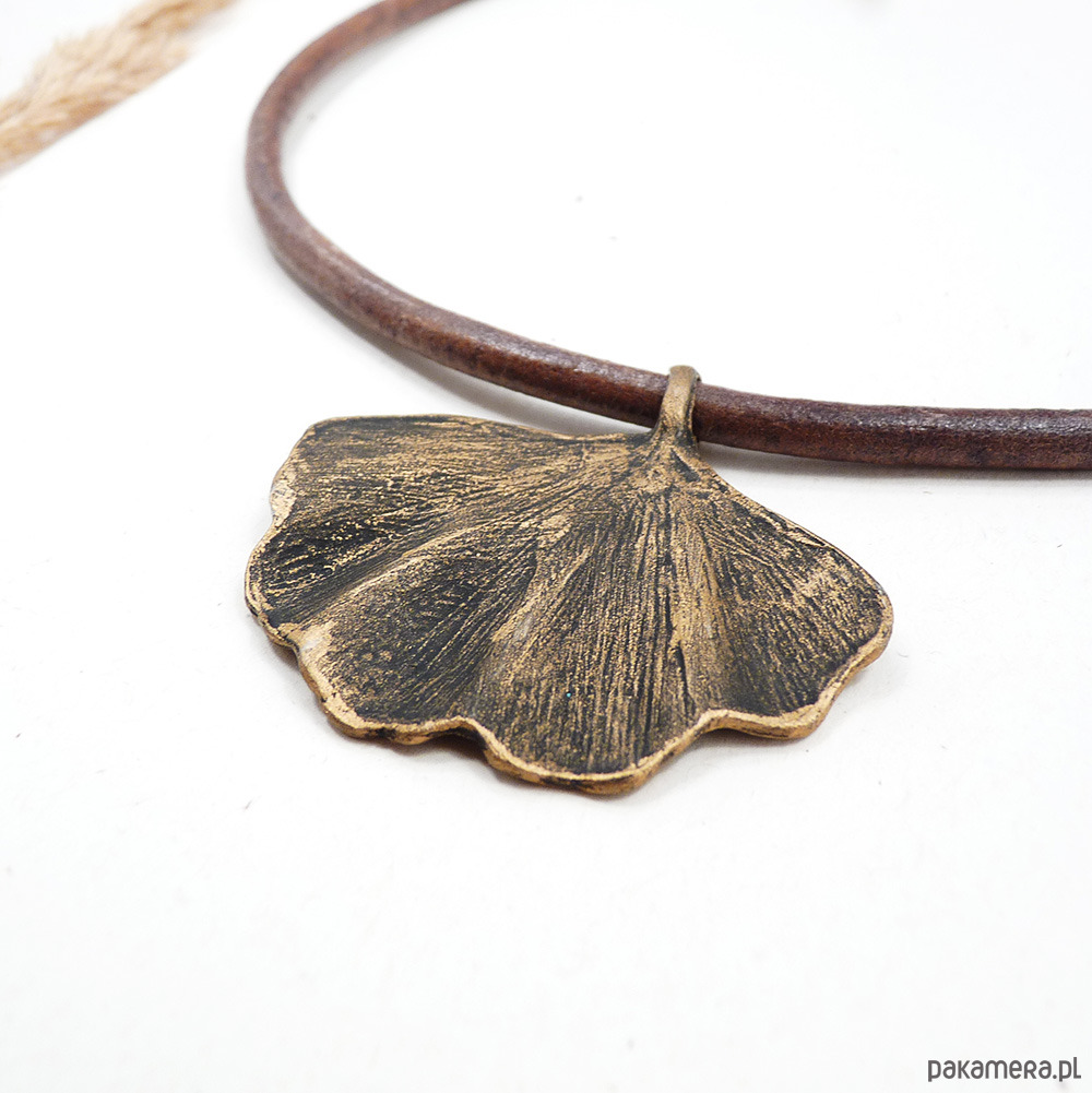 Stylowy naszyjnik z metalową zawieszką w kształcie liścia miłorzębu na solidnym rzemieniu