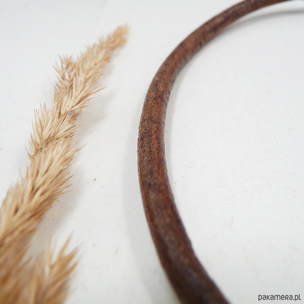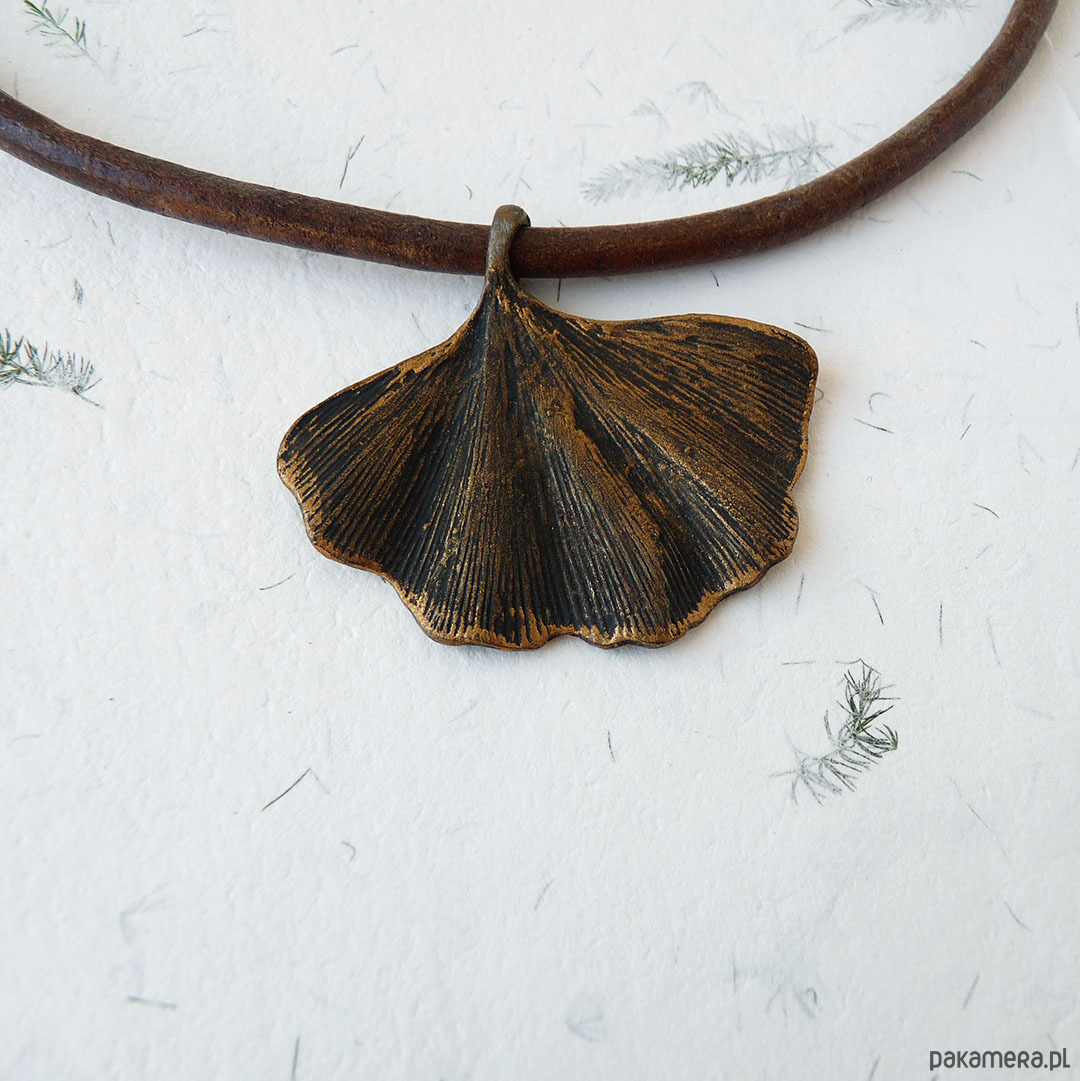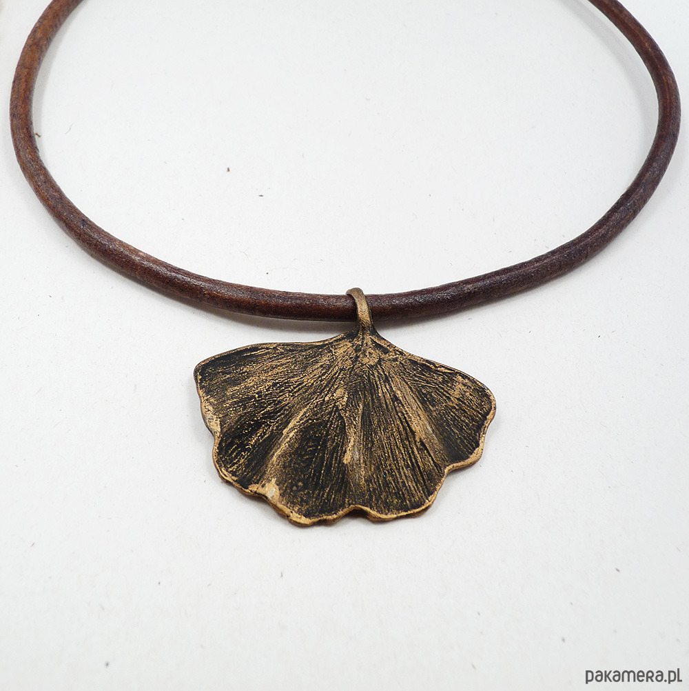 Stylowy naszyjnik z metalową zawieszką w kształcie liścia miłorzębu na solidnym rzemieniu