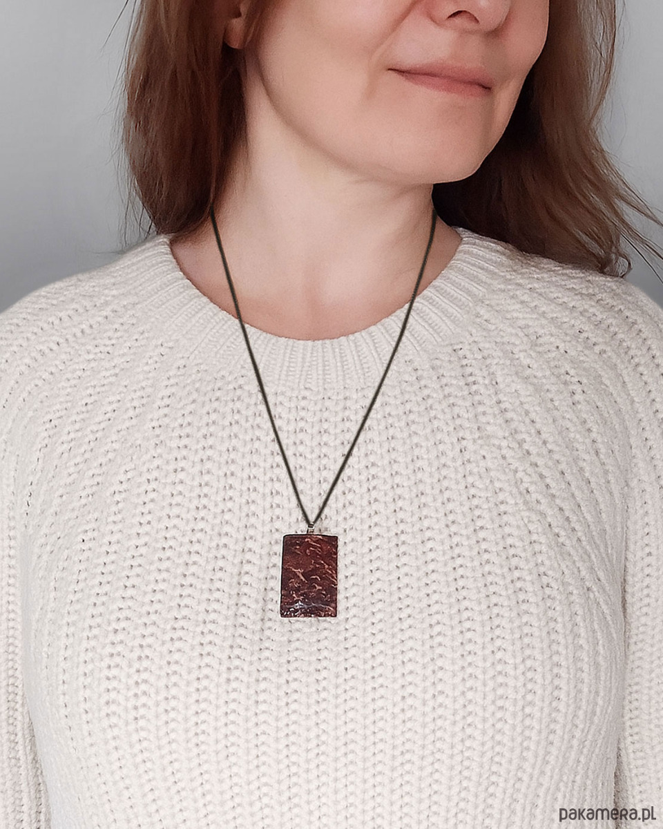 Wisior został wykonany ręcznie ze szlachetnej miedzi, ma nieregularną fakturę i jest lekko patynowany w procesie oksydacji (bez użycia sztucznych barwników). Całkowita długość wisiorka to ok 4,5 cm. W komplecie jest bawełniany sznurek do zawieszenia.