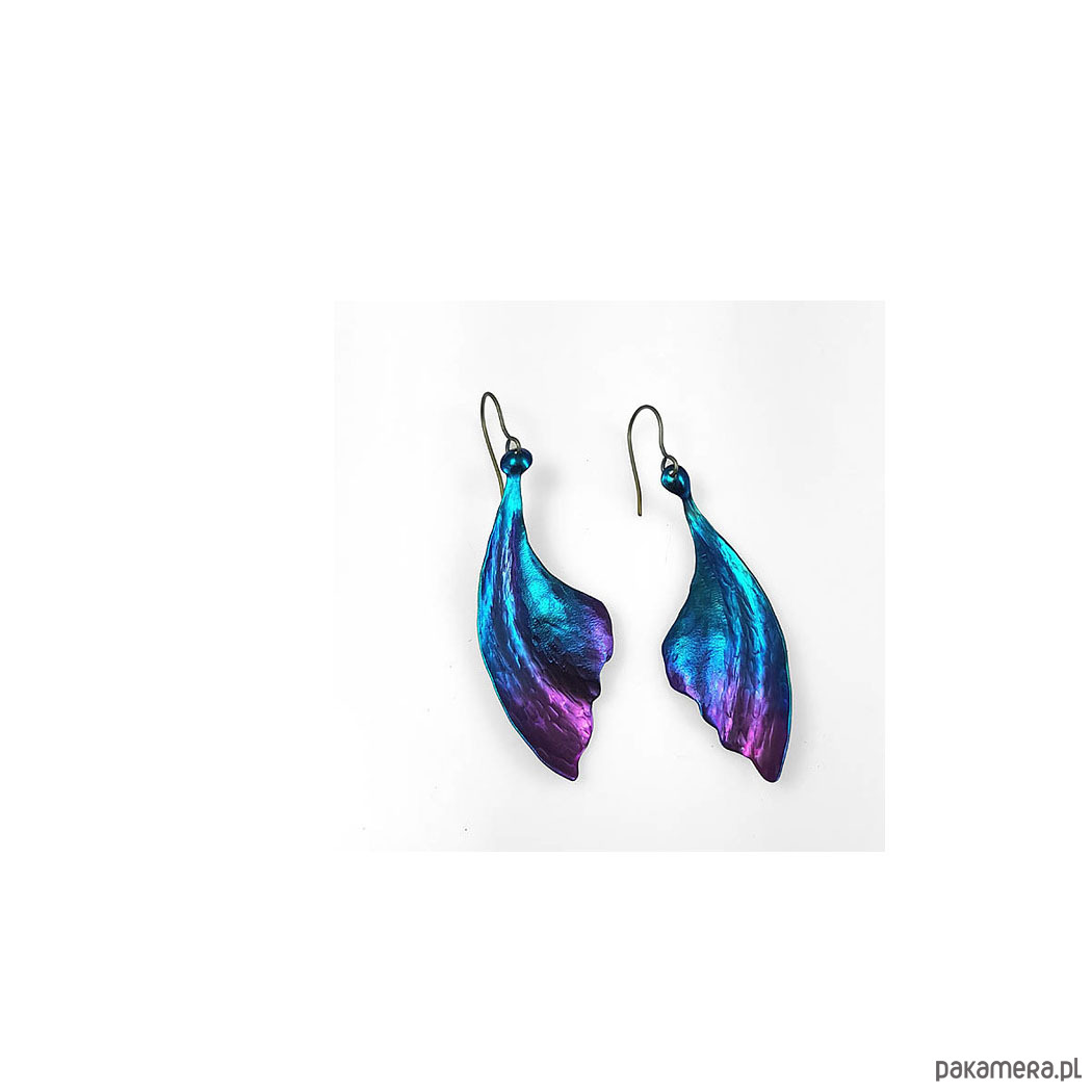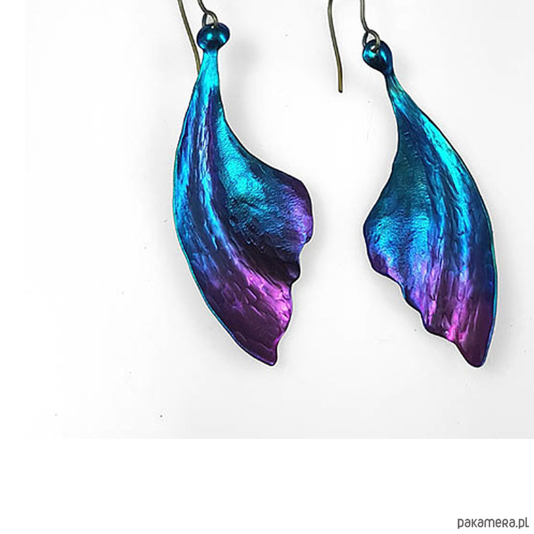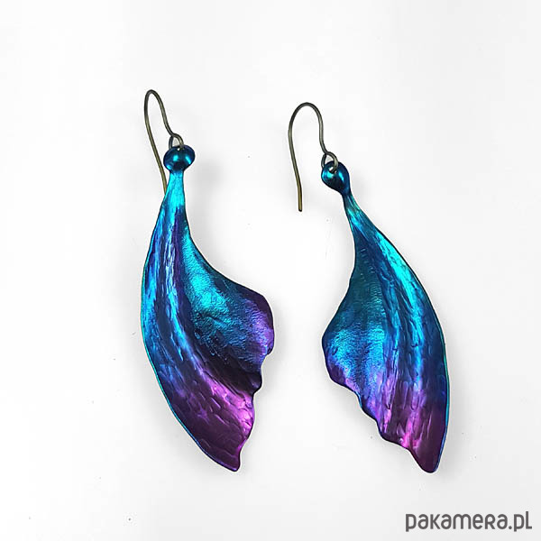 Kolczyki w kształcie liści w całości zrobiłem ręcznie z tytanu.Są lekkie, efektowne i mienią się kolorami.Są wielkości 3cm i długości 6,0 cm.W całości kolczyki są długości ok.7,5 cm. Zawieszka z tytanu .Na odwrocie sygnowane wygrawerowanym podpisem.Tytan jest niezwykle lekkim i trwałym metalem który nie wywołuje żadnych alergii-jest hipoalergiczny-stosowany w chirurgii i stomatologii. Odporny na działanie chemikaliów. Anodowany pokrywa się tlenkami o intensywnych kolorach które zachowują swą barwę przez wiele lat.