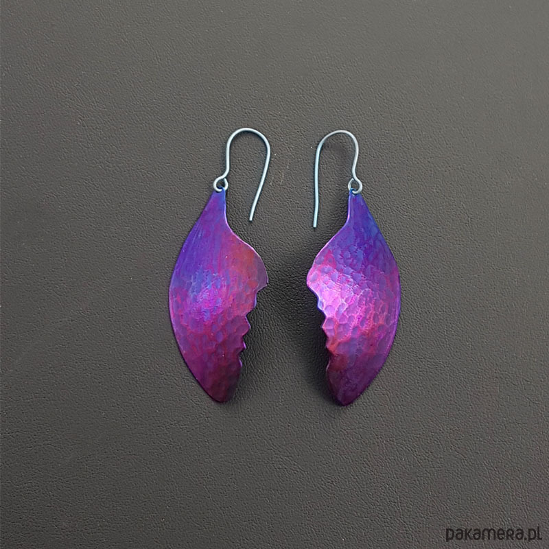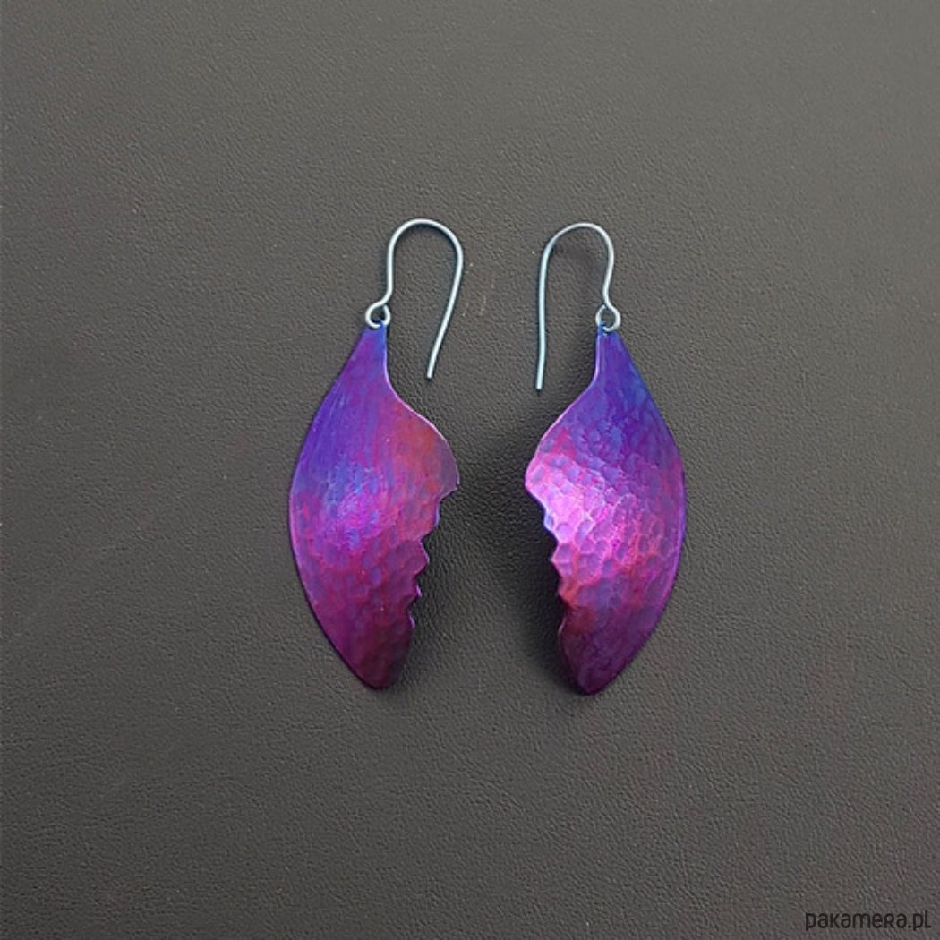 Kolczyki w kształcie liści w całości zrobiłem ręcznie z tytanu.Są lekkie, efektowne i mienią się kolorami.Są wielkości 2,5 cm i długości 5 cm.W całości kolczyki są długości ok.6 cm. Zawieszka z tytanu .Na odwrocie sygnowane wygrawerowanym podpisem.Tytan jest niezwykle lekkim i trwałym metalem który nie wywołuje żadnych alergii-jest hipoalergiczny-stosowany w chirurgii i stomatologii. Odporny na działanie chemikaliów. Anodowany pokrywa się tlenkami o intensywnych kolorach które zachowują swą barwę przez wiele lat.