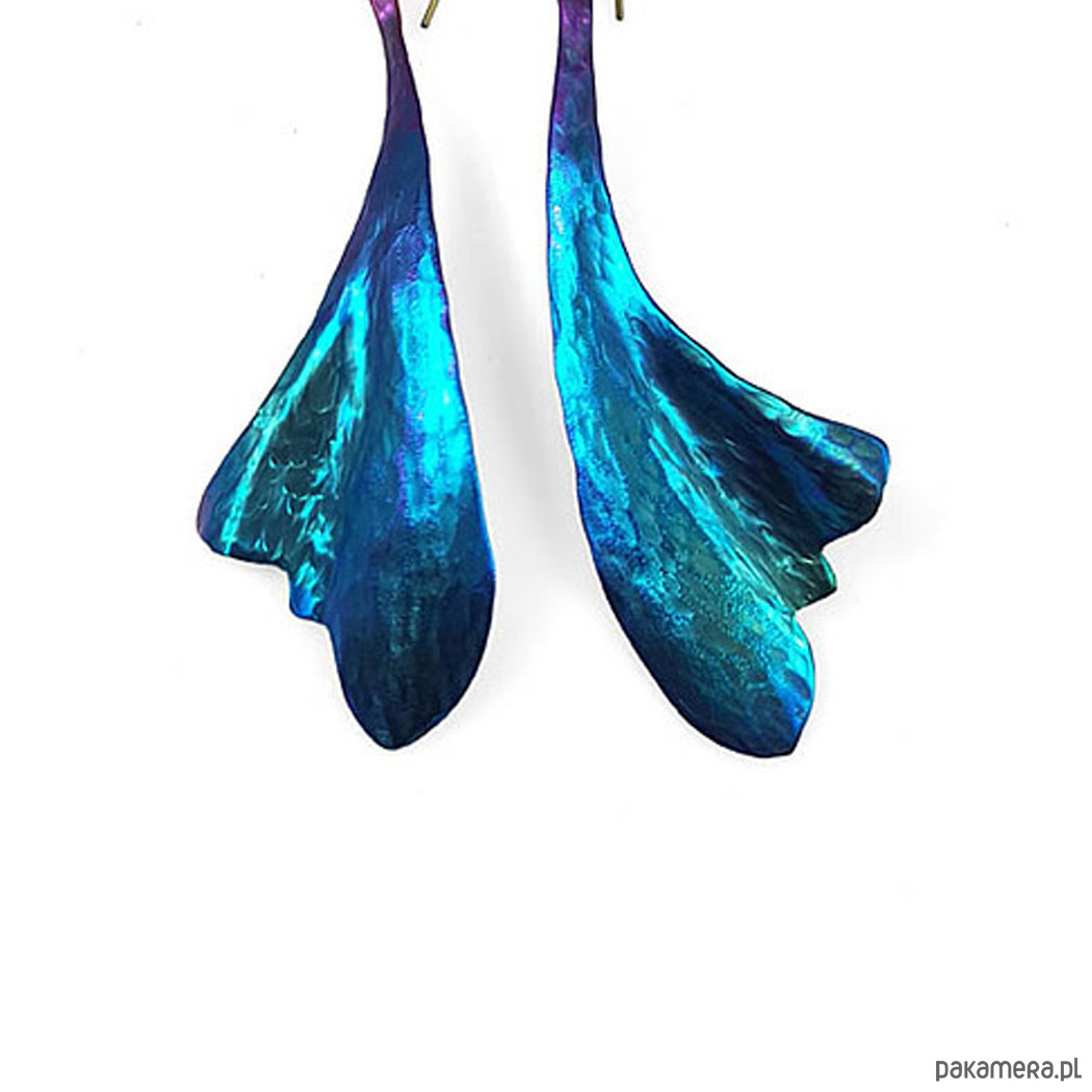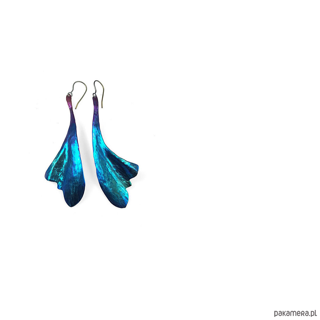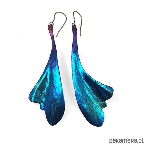 Kolczyki w kształcie liści w całości zrobiłem ręcznie z tytanu.Są lekkie, efektowne i mienią się kolorami.Są wielkości 3 cm i długości 7,0 cm.W całości kolczyki są długości ok.8,5 cm. Zawieszka z tytanu .Na odwrocie sygnowane wygrawerowanym podpisem.Tytan jest niezwykle lekkim i trwałym metalem który nie wywołuje żadnych alergii-jest hipoalergiczny-stosowany w chirurgii i stomatologii. Odporny na działanie chemikaliów. Anodowany pokrywa się tlenkami o intensywnych kolorach które zachowują swą barwę przez wiele lat.