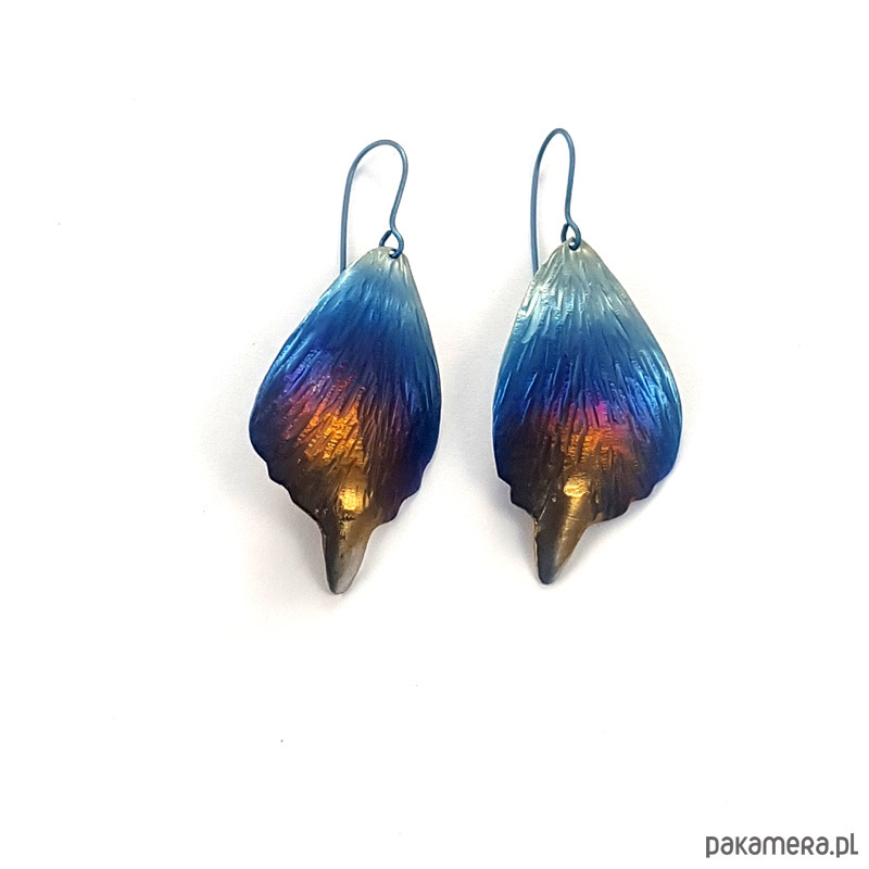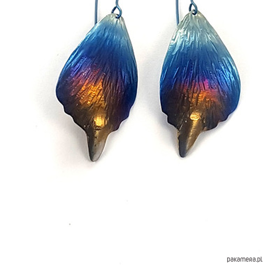 Kolczyki w kształcie liści w całości zrobiłem ręcznie z tytanu.Są lekkie, efektowne i mienią się kolorami.Są wielkości 2,5 cm i długości 4, 5 cm.W całości kolczyki są długości ok.5,5 cm. Zawieszka z tytanu .Na odwrocie sygnowane wygrawerowanym podpisem.Tytan jest niezwykle lekkim i trwałym metalem który nie wywołuje żadnych alergii-jest hipoalergiczny-stosowany w chirurgii i stomatologii. Odporny na działanie chemikaliów. Anodowany pokrywa się tlenkami o intensywnych kolorach które zachowują swą barwę przez wiele lat.