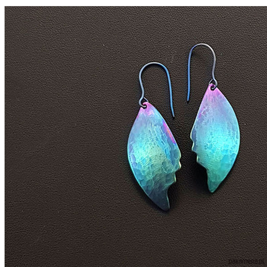 Kolczyki w kształcie liści w całości zrobiłem ręcznie z tytanu.Są lekkie, efektowne i mienią się kolorami.Są wielkości 2,3 cm i długości 4,5 cm.W całości kolczyki są długości ok.5,5 cm. Zawieszka z tytanu .Na odwrocie sygnowane wygrawerowanym podpisem.Tytan jest niezwykle lekkim i trwałym metalem który nie wywołuje żadnych alergii-jest hipoalergiczny-stosowany w chirurgii i stomatologii. Odporny na działanie chemikaliów. Anodowany pokrywa się tlenkami o intensywnych kolorach które zachowują swą barwę przez wiele lat.