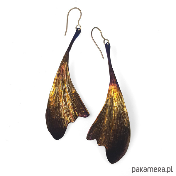 Kolczyki w kształcie liści w całości zrobiłem ręcznie z tytanu.Są lekkie, efektowne i mienią się kolorami.Są wielkości 3 cm i długości 7,0 cm.W całości kolczyki są długości ok.8,5 cm. Zawieszka z tytanu .Na odwrocie sygnowane wygrawerowanym podpisem.Tytan jest niezwykle lekkim i trwałym metalem który nie wywołuje żadnych alergii-jest hipoalergiczny-stosowany w chirurgii i stomatologii. Odporny na działanie chemikaliów. Anodowany pokrywa się tlenkami o intensywnych kolorach które zachowują swą barwę przez wiele lat.