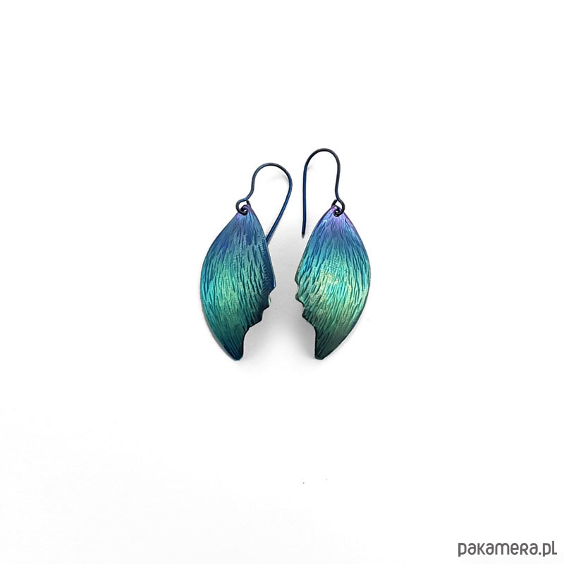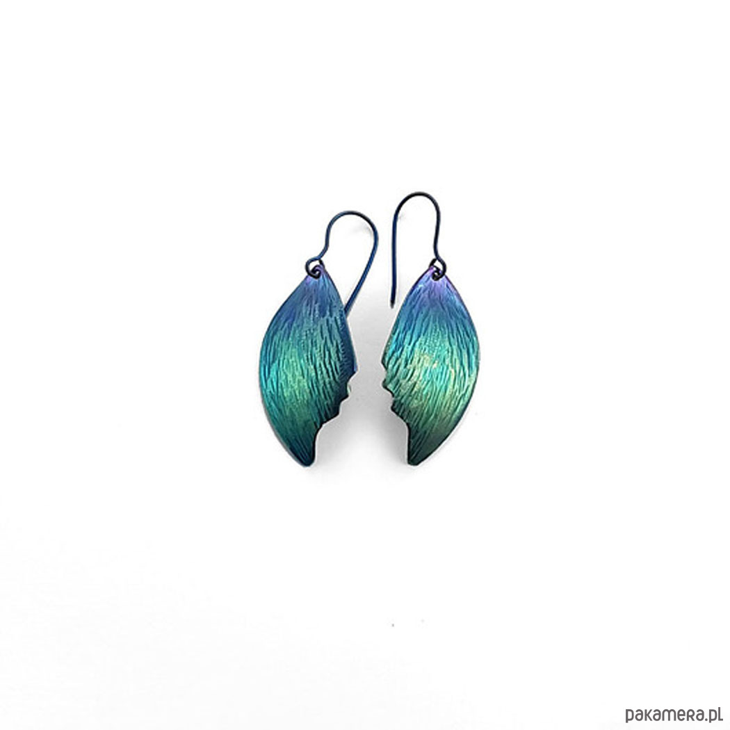 Kolczyki w kształcie liści w całości zrobiłem ręcznie z tytanu.Są lekkie, efektowne i mienią się kolorami.Są wielkości 2,3 cm i długości 4,5 cm.W całości kolczyki są długości ok.5,5 cm. Zawieszka z tytanu .Na odwrocie sygnowane wygrawerowanym podpisem.Tytan jest niezwykle lekkim i trwałym metalem który nie wywołuje żadnych alergii-jest hipoalergiczny-stosowany w chirurgii i stomatologii. Odporny na działanie chemikaliów. Anodowany pokrywa się tlenkami o intensywnych kolorach które zachowują swą barwę przez wiele lat.
