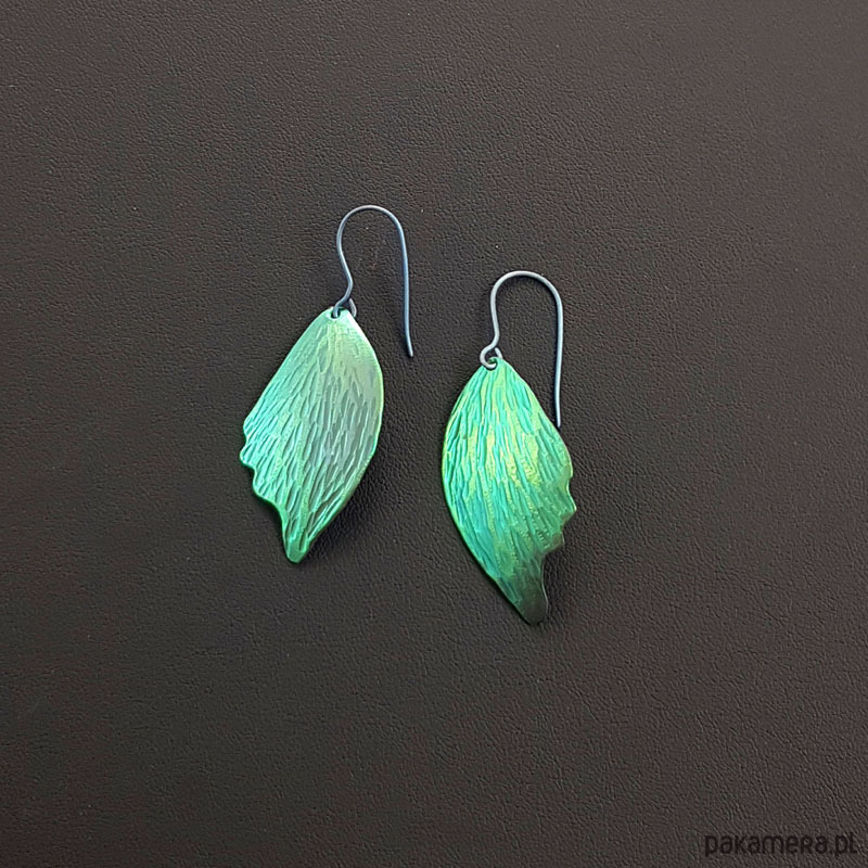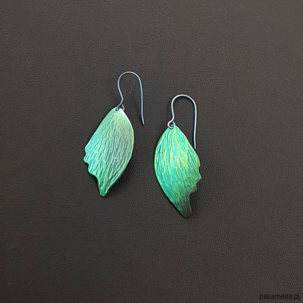 Kolczyki w kształcie liści w całości zrobiłem ręcznie z tytanu.Są lekkie, efektowne i mienią się kolorami.Są wielkości 2,3 cm i długości 4,5 cm.W całości kolczyki są długości ok.5,5 cm. Zawieszka z tytanu .Na odwrocie sygnowane wygrawerowanym podpisem.Tytan jest niezwykle lekkim i trwałym metalem który nie wywołuje żadnych alergii-jest hipoalergiczny-stosowany w chirurgii i stomatologii. Odporny na działanie chemikaliów. Anodowany pokrywa się tlenkami o intensywnych kolorach które zachowują swą barwę przez wiele lat.