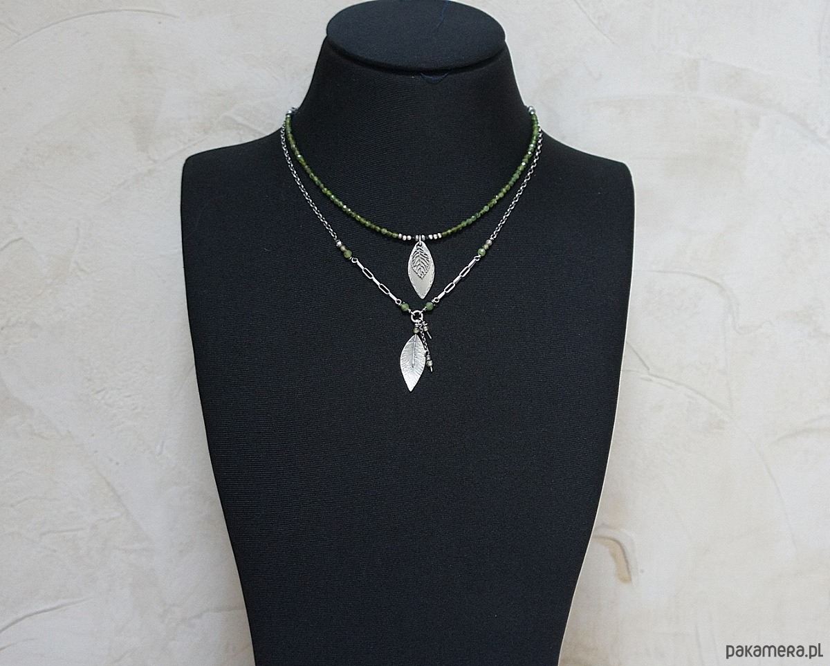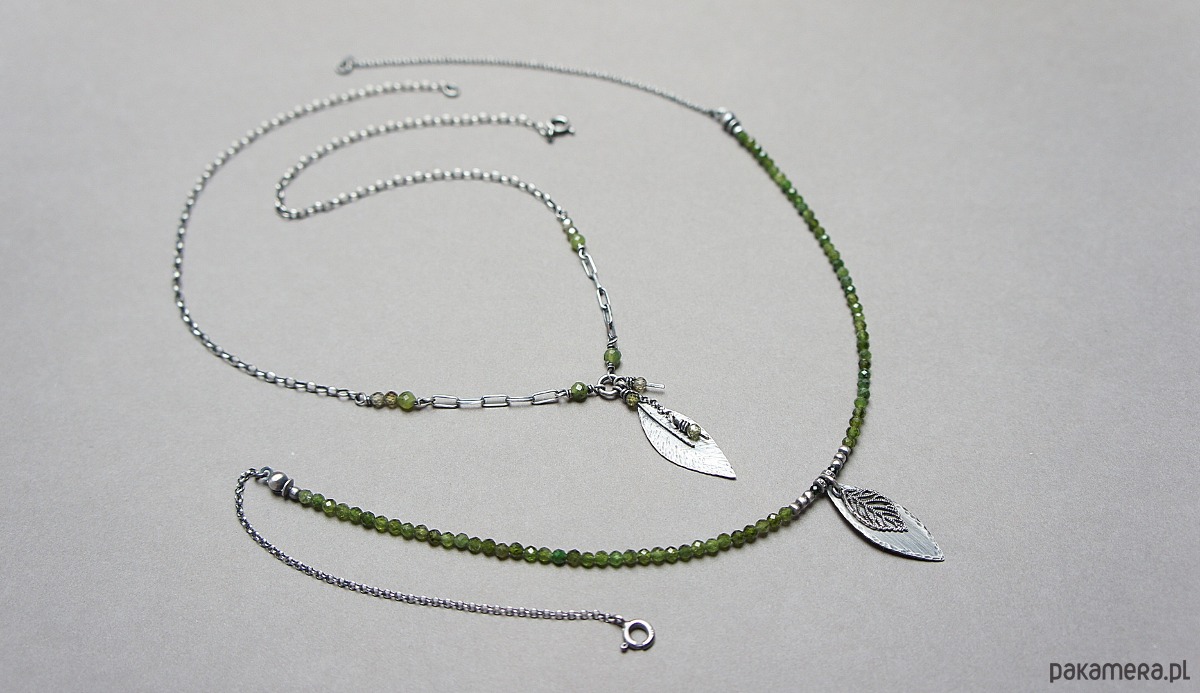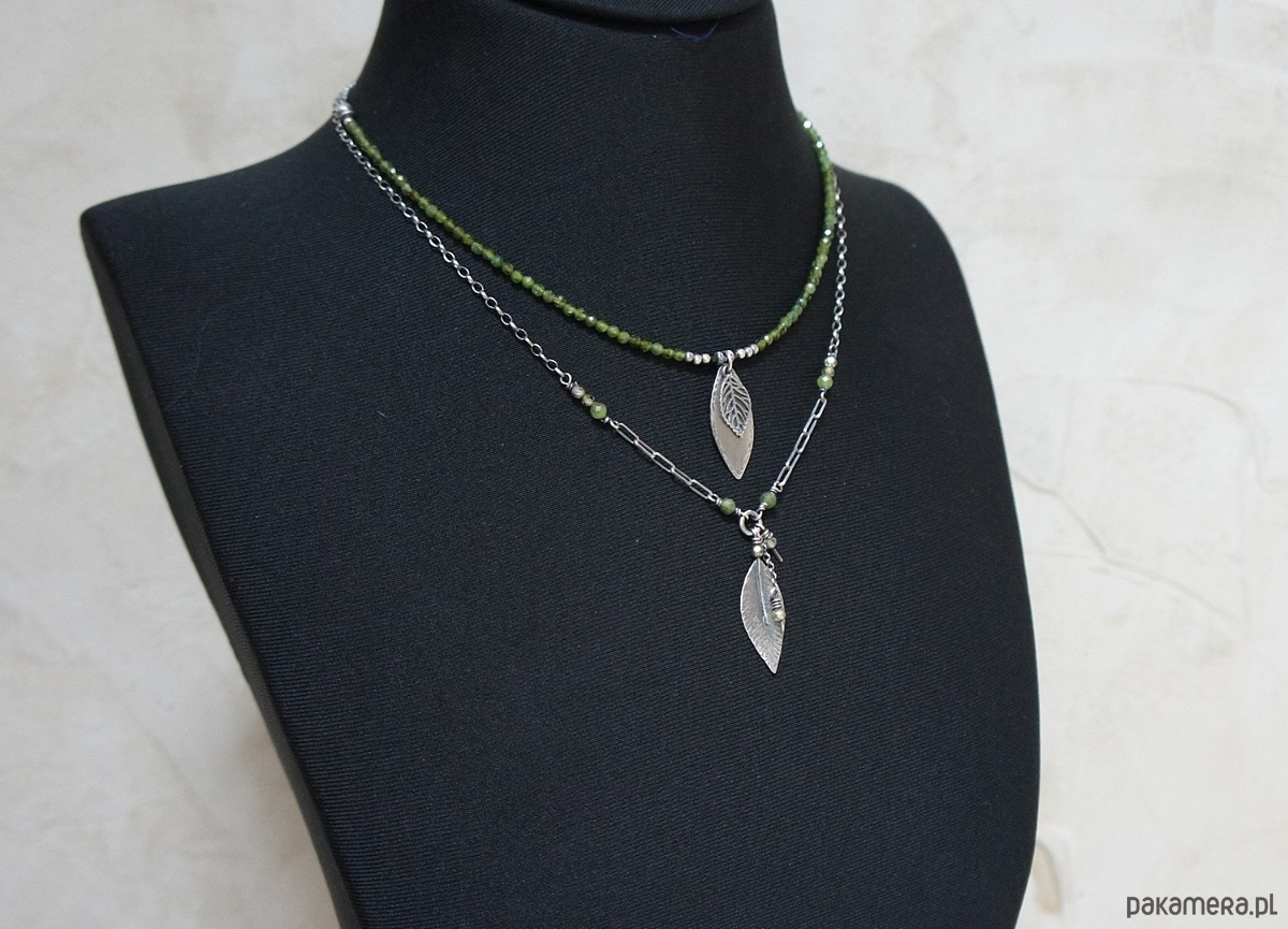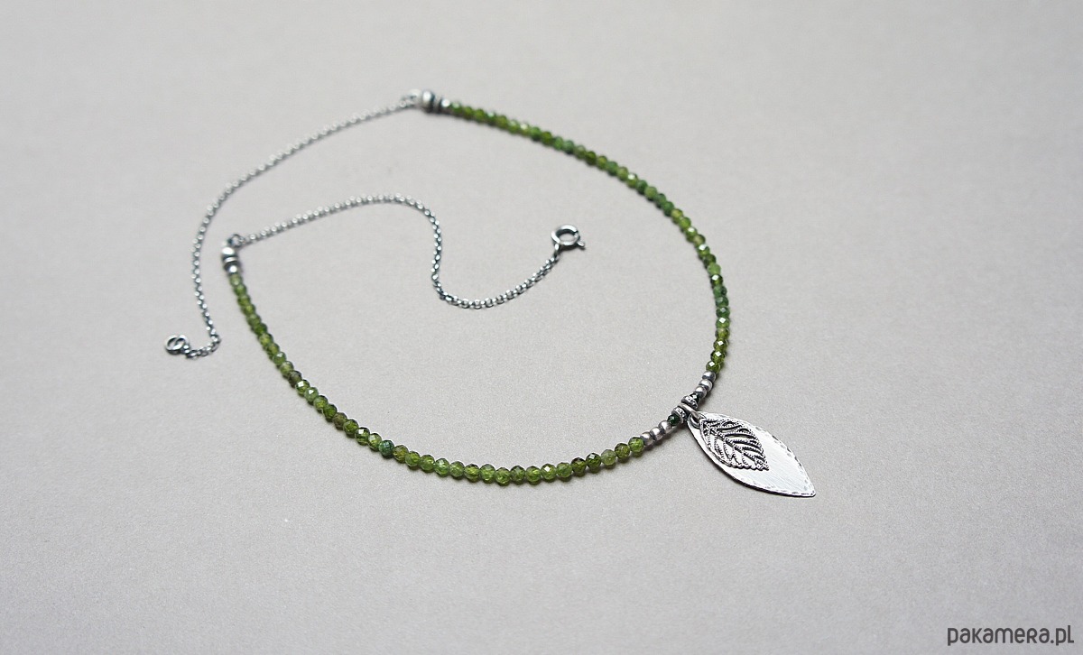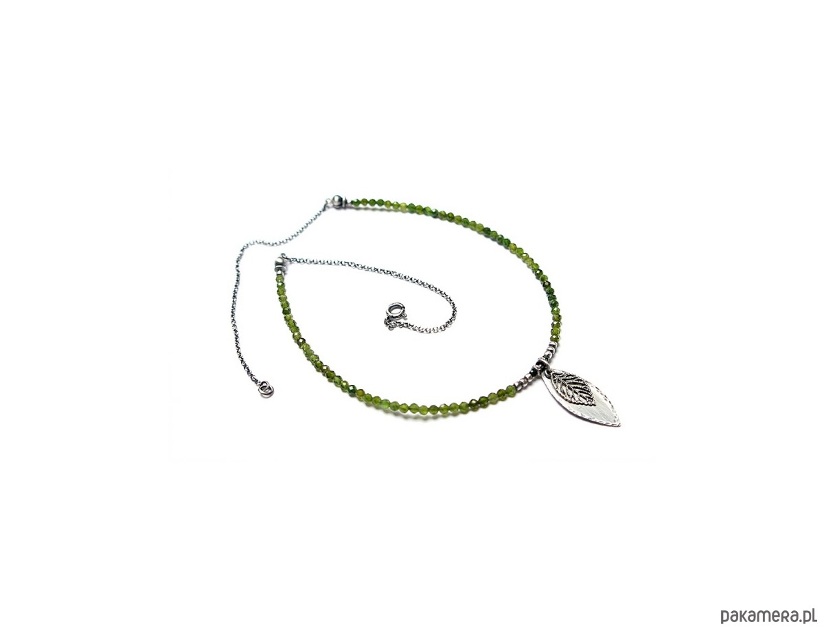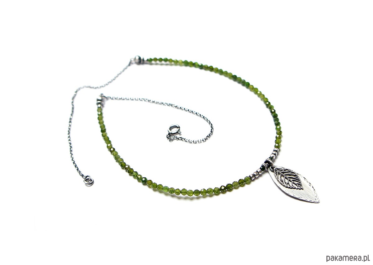 Krótki naszyjnik wykonany ze srebra [pr. 925] w połączeniu z fasetowanymi kuleczkami diopsydów [2mm] oraz srebrnymi zawieszkami [18mm i 28mm]. Całość oksydowana i przetarta. Całkowita długość naszyjnika 46cm. Biżuteria ozdobnie zapakowana. Naszyjnik może stanowić komplet z innym naszyjnikiem z motywem liścia widocznym na zdjęciach .