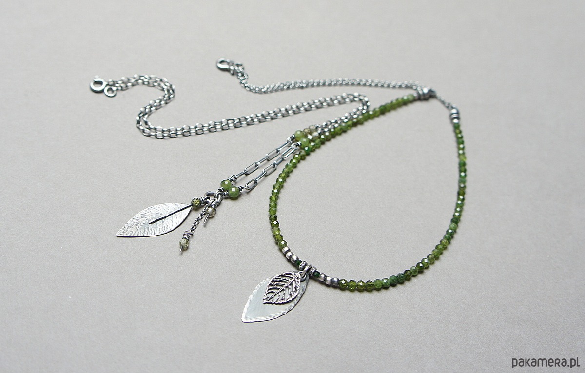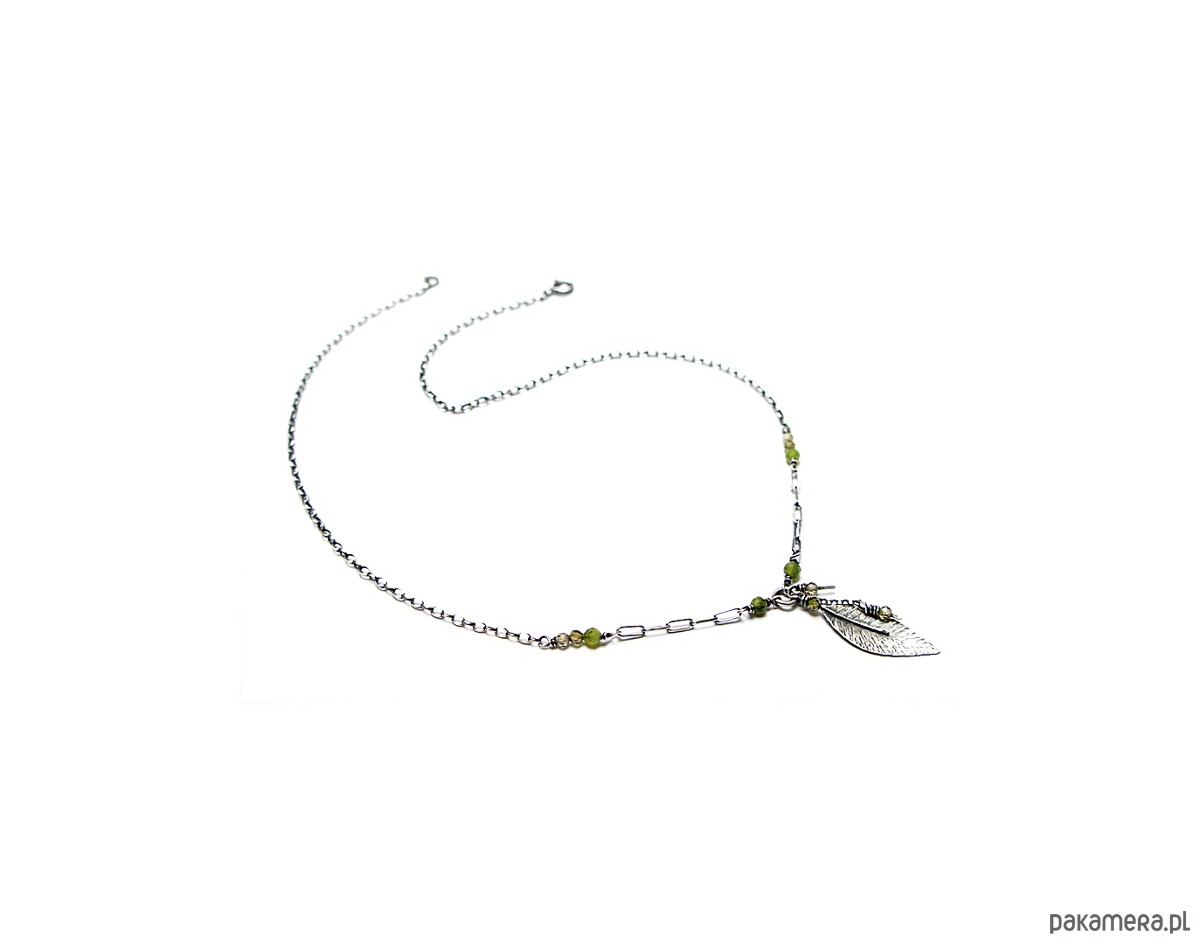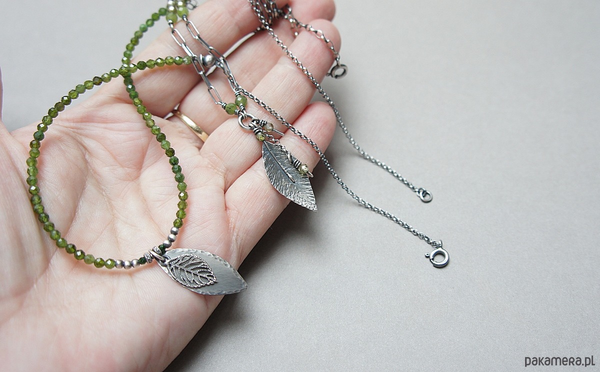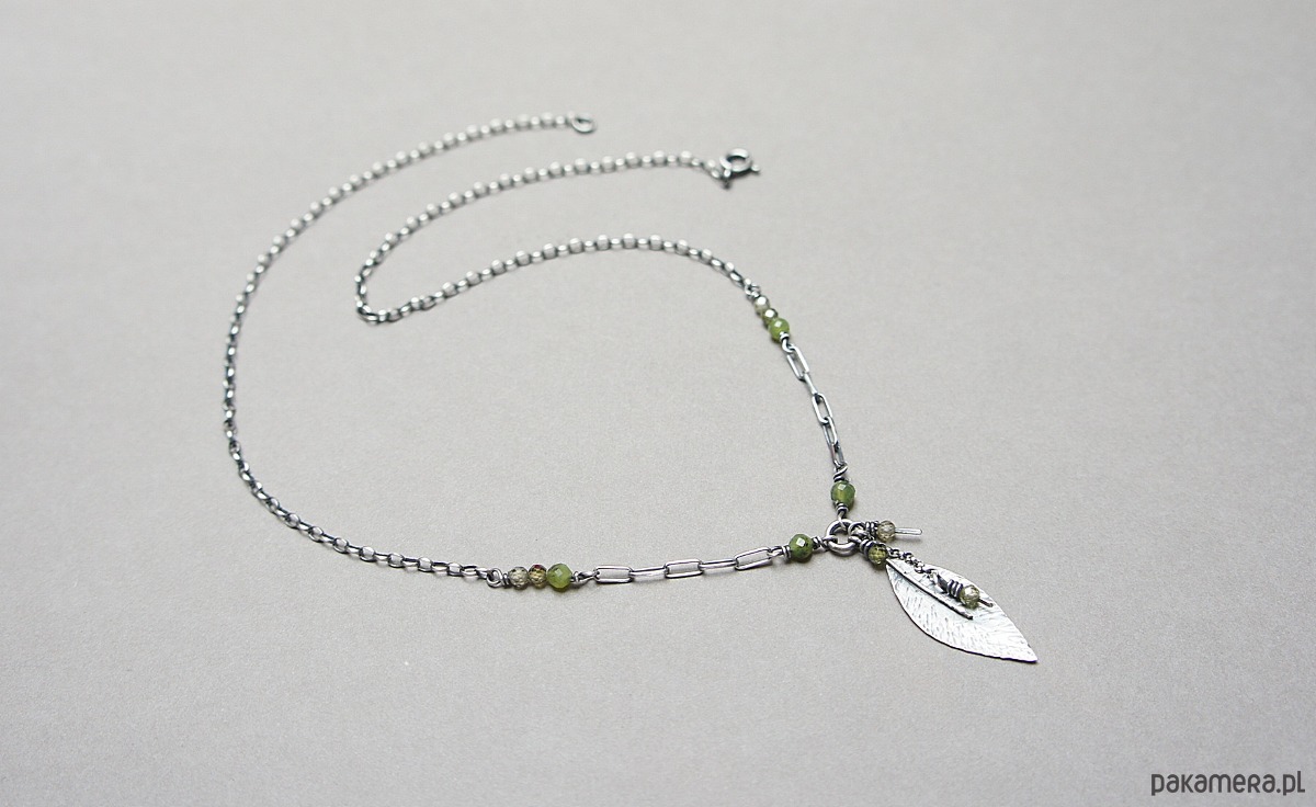Krótki naszyjnik wykonany własnoręcznie ze srebra [pr. 925] w połączeniu z fasetowanymi kuleczkami diopsydów [4mm] ,cyrkoniami [3mm] oraz srebrnym listkiem [34mm]. Całość oksydowana i przetarta. Całkowita długość naszyjnika 45,5cm. Biżuteria ozdobnie zapakowana. Naszyjnik może stanowić komplet z innym naszyjnikiem z motywem liścia widocznym na zdjęciach .