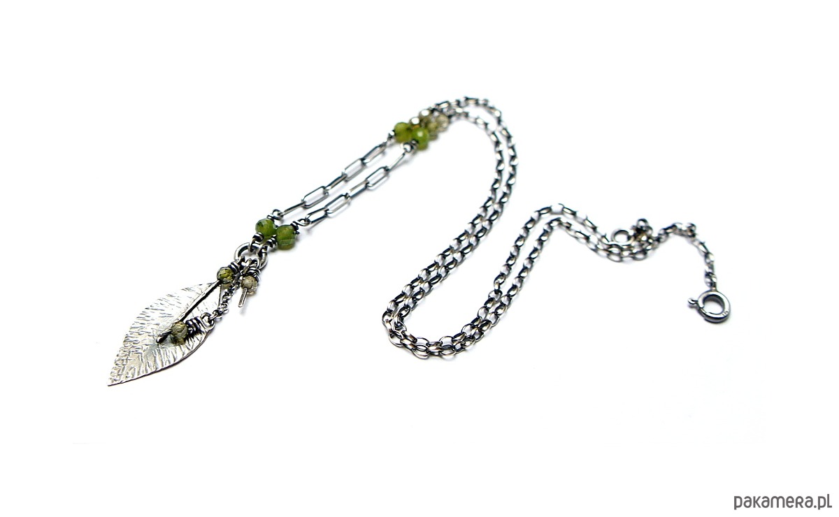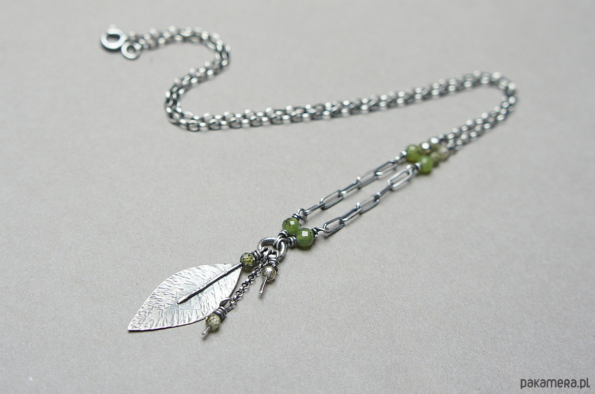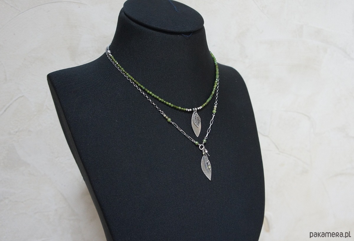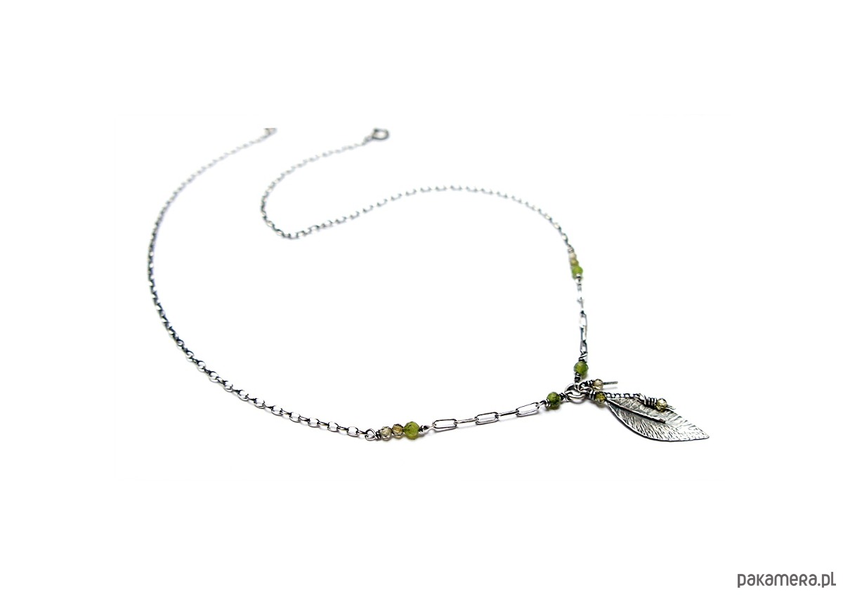 Krótki naszyjnik wykonany własnoręcznie ze srebra [pr. 925] w połączeniu z fasetowanymi kuleczkami diopsydów [4mm] ,cyrkoniami [3mm] oraz srebrnym listkiem [34mm]. Całość oksydowana i przetarta. Całkowita długość naszyjnika 45,5cm. Biżuteria ozdobnie zapakowana. Naszyjnik może stanowić komplet z innym naszyjnikiem z motywem liścia widocznym na zdjęciach .