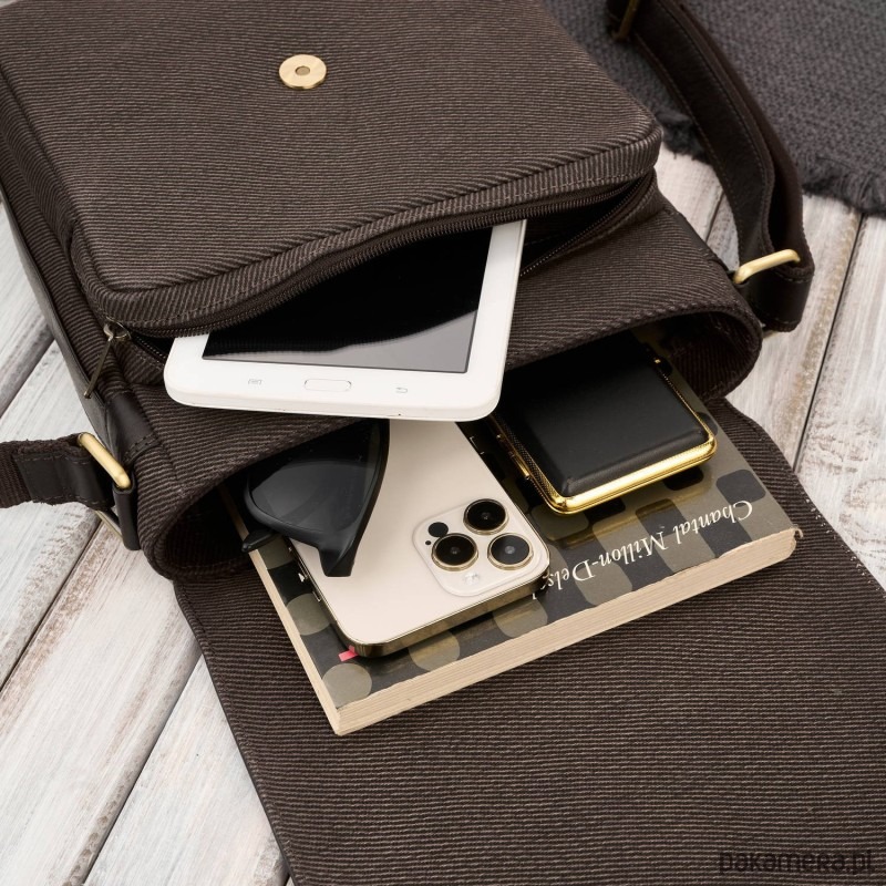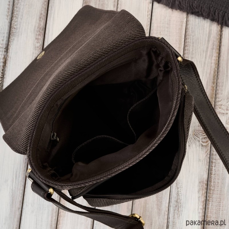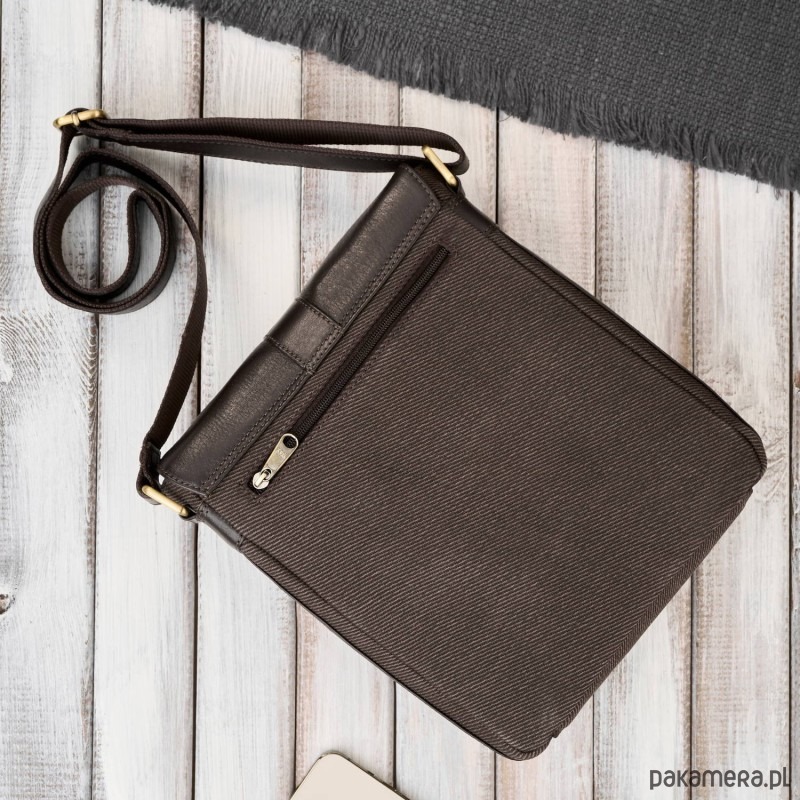 Torba męska na ramię została uszyta w połączeniu ze skóry naturalnej i bawełnianym canvasem. Taki duet to nie tylko walory estetyczne. Kryję się za tym niezwykła trwałość i odporność na intensywne użytkowanie produktu.