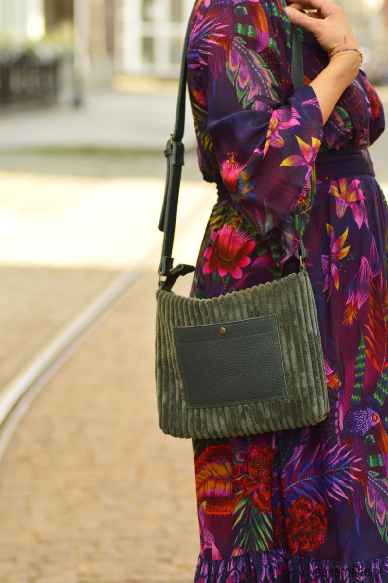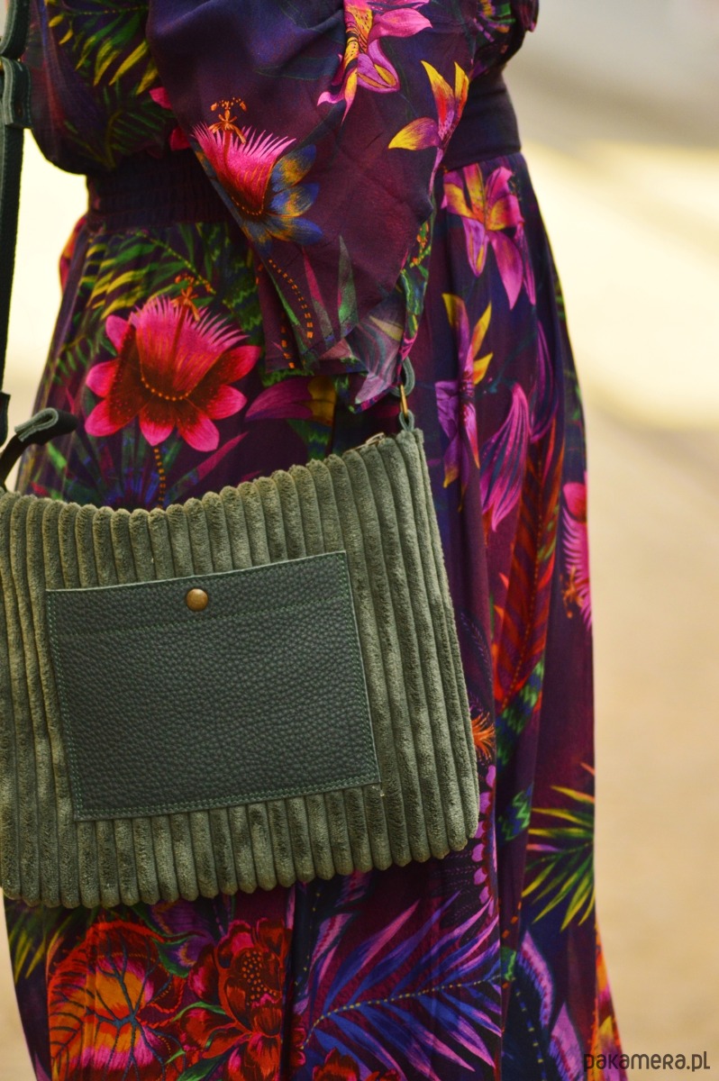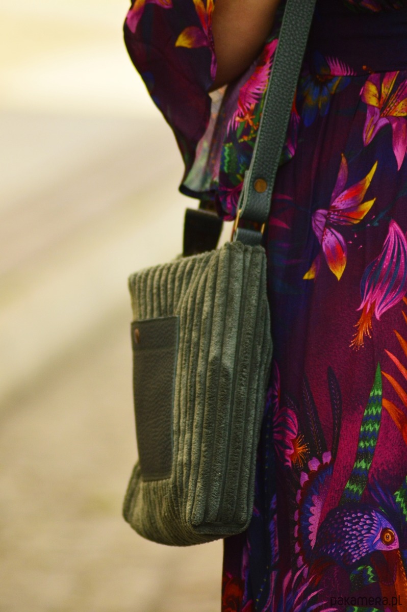 Torba powstała z gobelinu oraz skóry naturalnej (regulowany pasek, łączenia oraz chwost). Dodatkowo torebeczka jest wzmocniona warstwą wodoodporną. Torba zapina się na suwak, a wewnątrz znajduje się mała kieszonka na suwak. Skórzany pasek posiada regulację na klamrę.