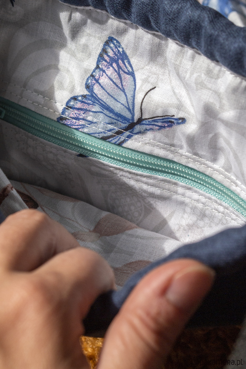 Środek torebki wykończony jest bawełnianą podszewką.