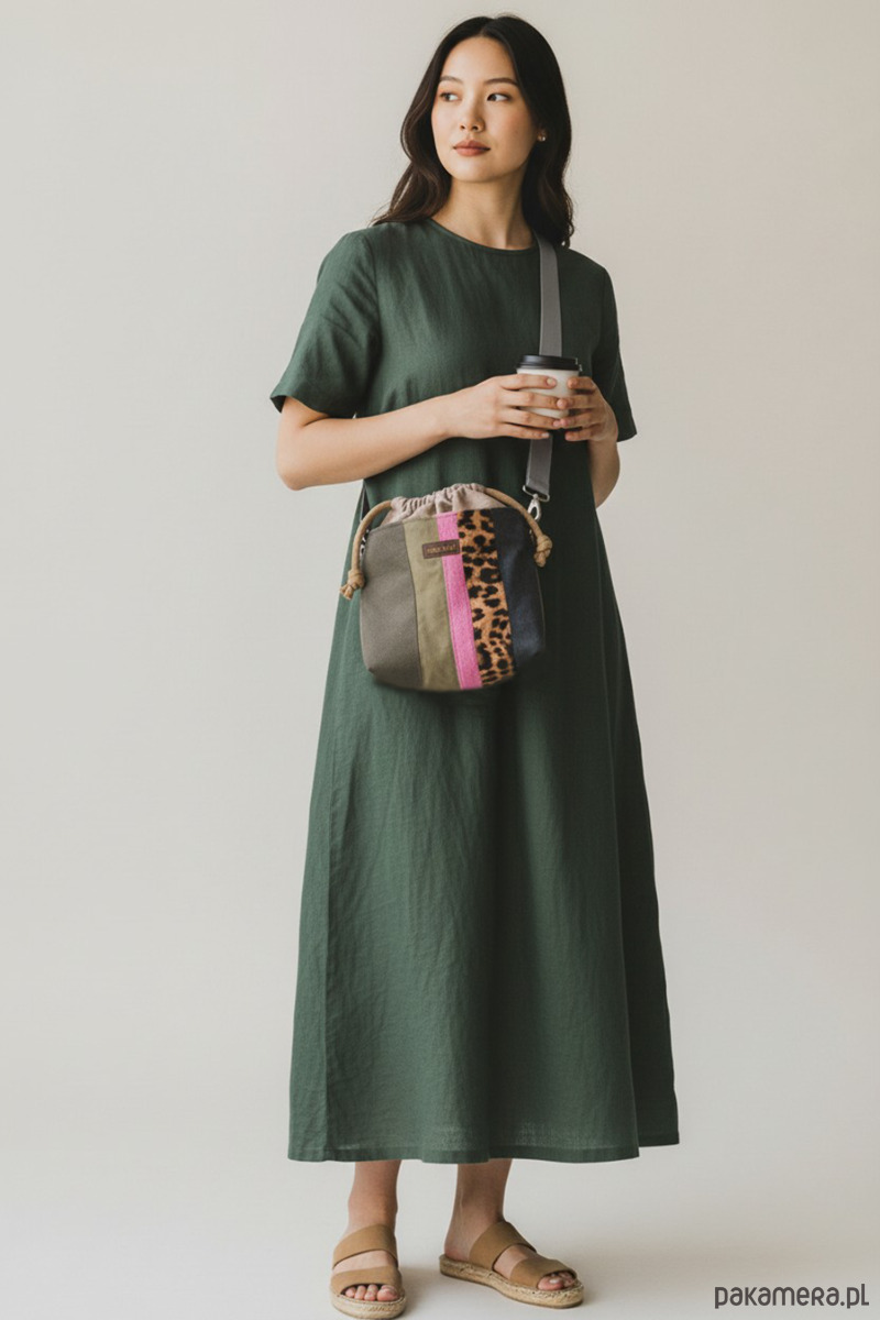 Mała damska torebka typu worek z kominem.