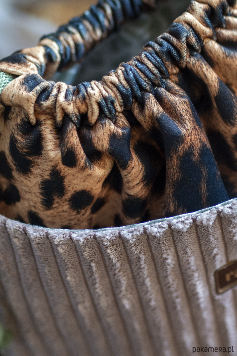 Wykonana z weluru w panterkę. Z przodu oraz z na tyle torebki kieszenie (np. na telefon czy chusteczki) z pudroworóżowego grubego sztruksu. W środku kieszonka zapinana na suwak.