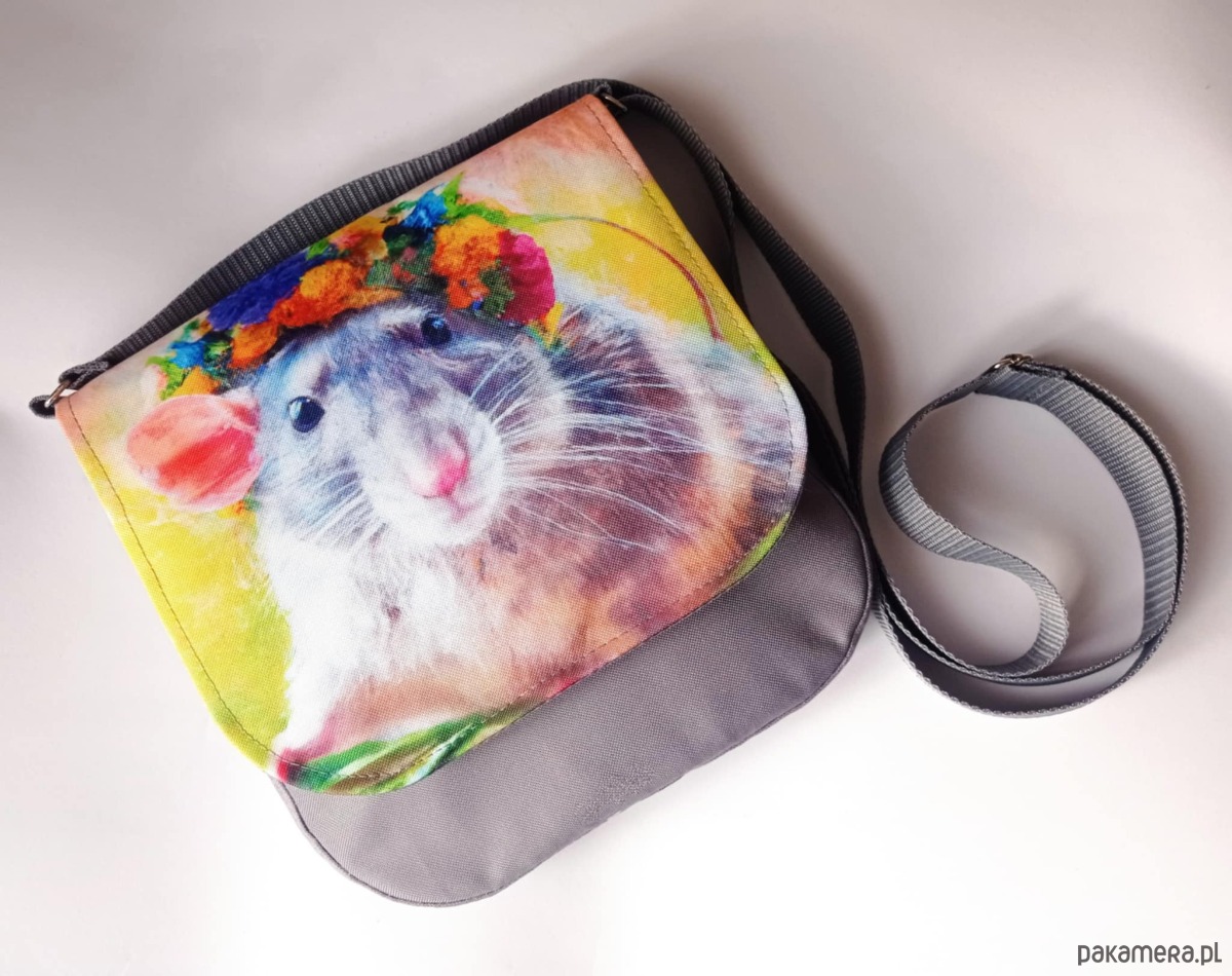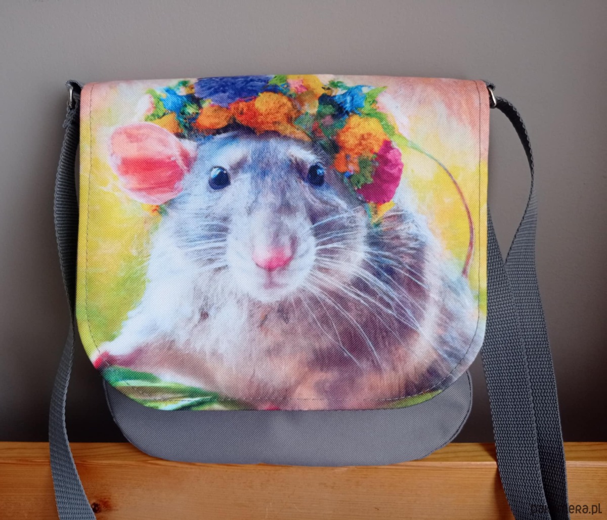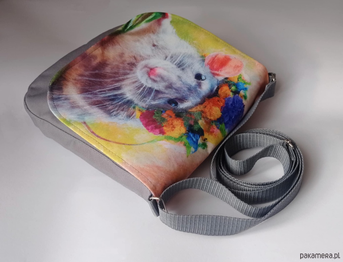 Piękna listonoszka z szarej tkaniny wodoodpornej z motywem szczurka w kwiatach.