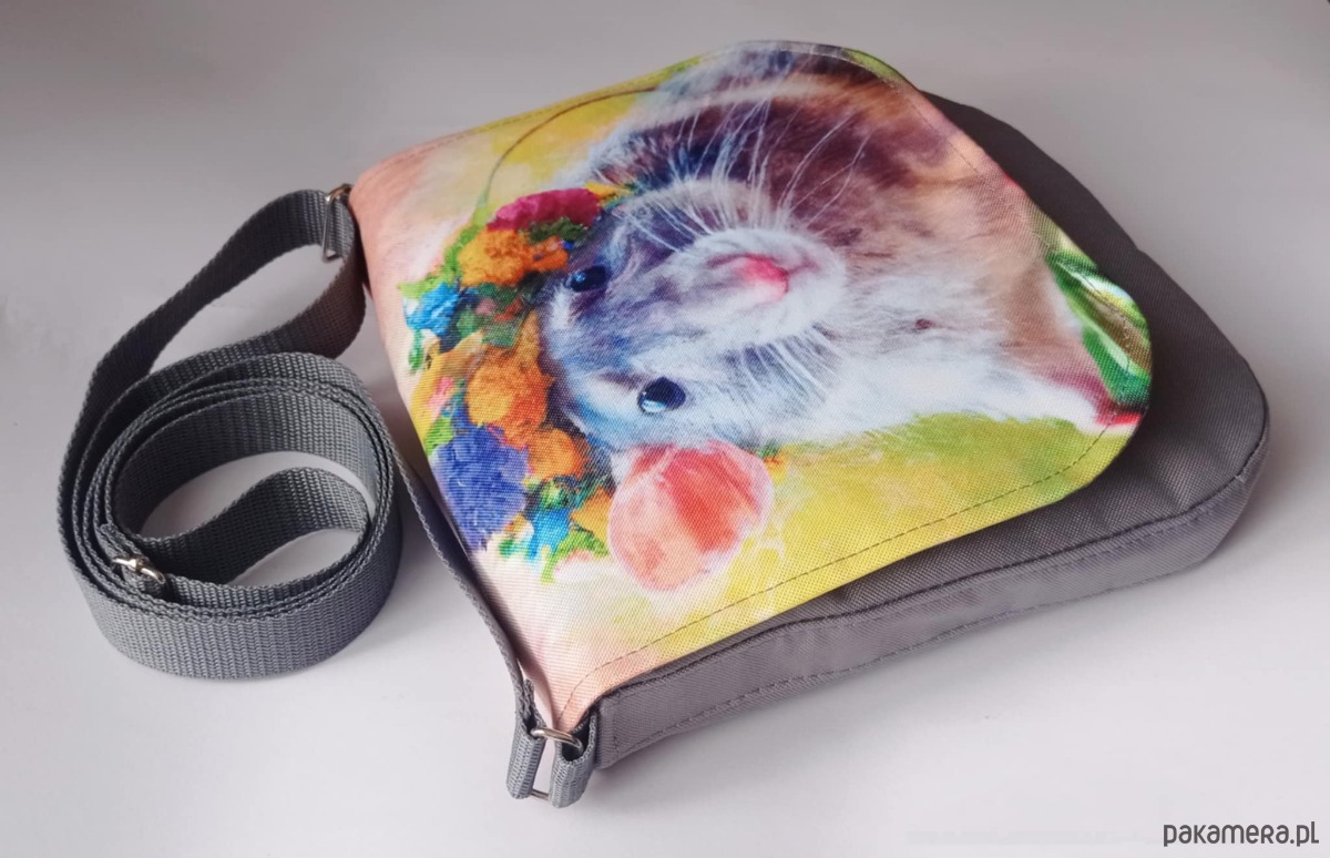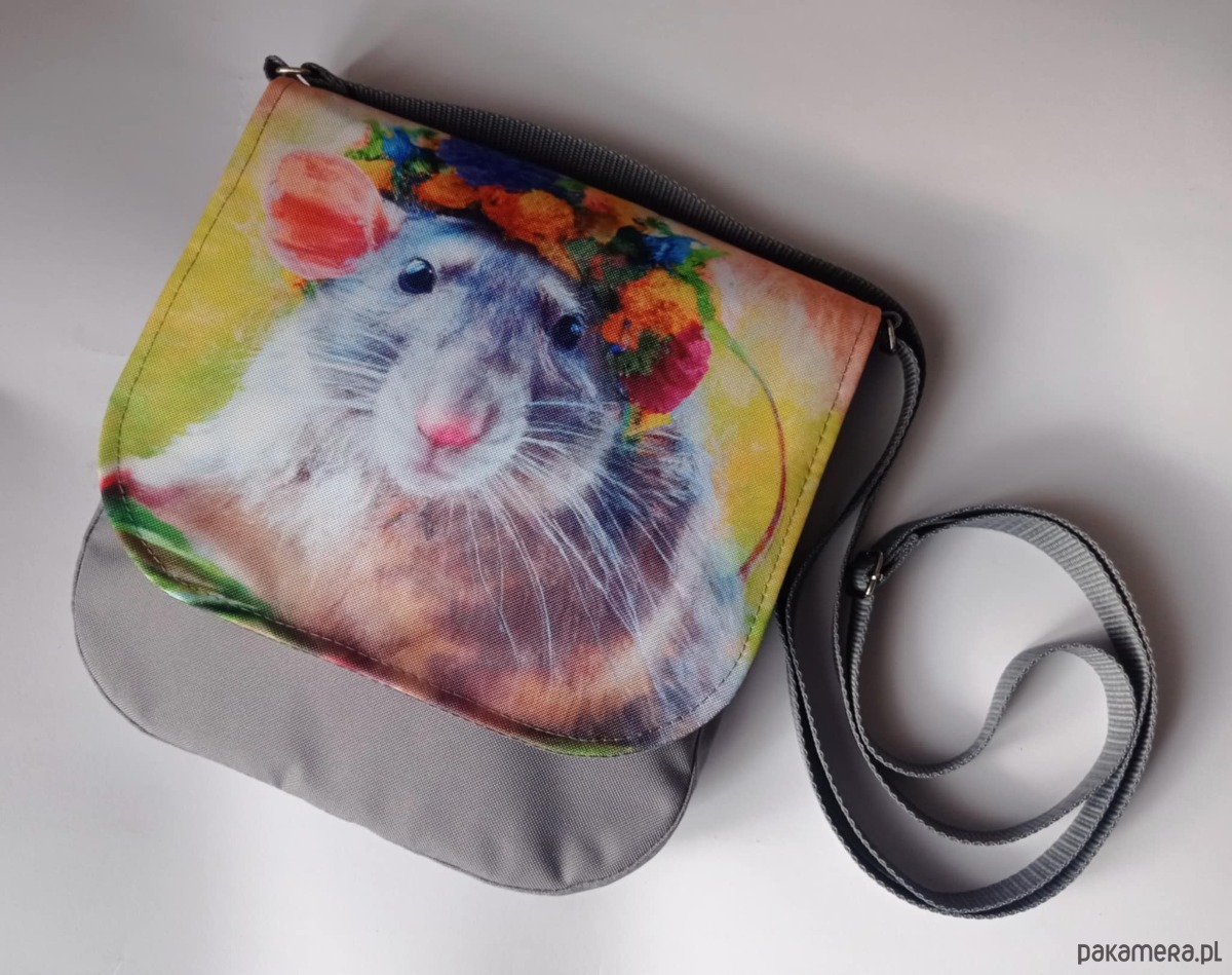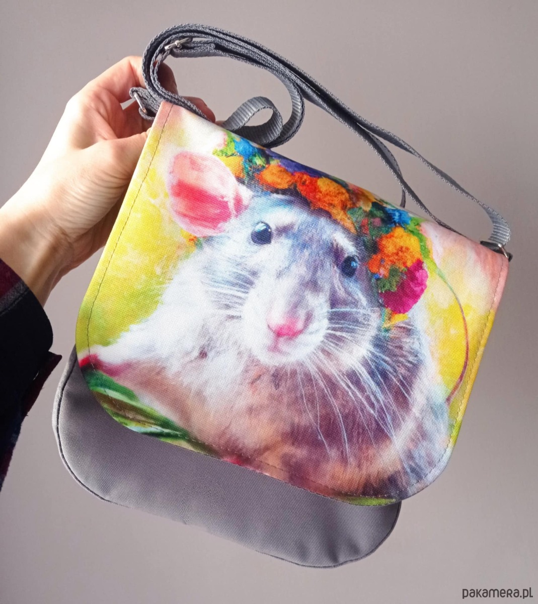 Piękna listonoszka z szarej tkaniny wodoodpornej z motywem szczurka w kwiatach.