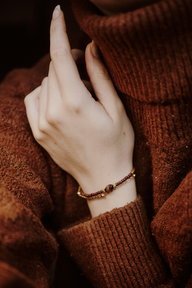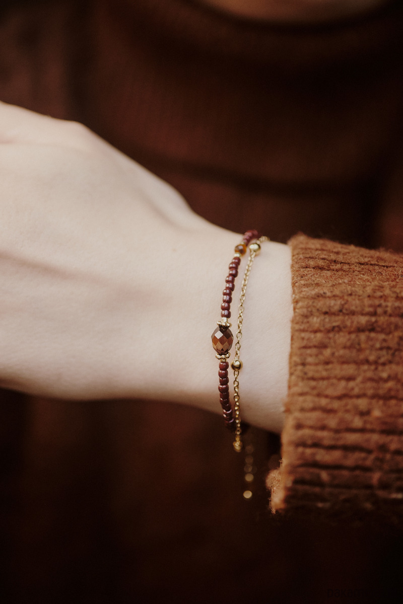 Listopadwóka inspirowana jest gorącym trendem AW2025 czyli czekoladowym brązem. Zyskał on miano nowej czerni, oferując głębię i elegancję w cieplejszym wydaniu. Otula nas i dodaje szyku. W centrum znajduje się pięknie ciosana bryłka tygrysiego oka. Bransoletka składa się również z łańcuszka, który dodaje jej warstwowości.