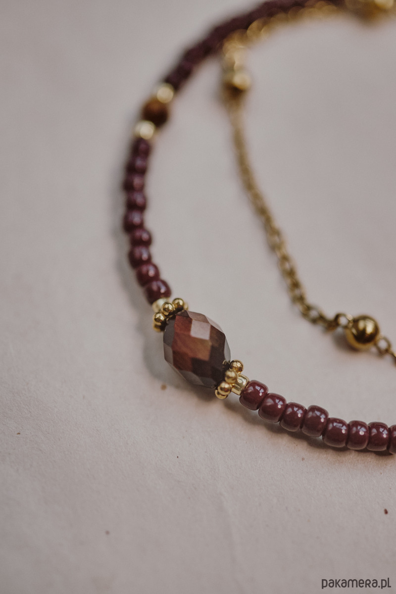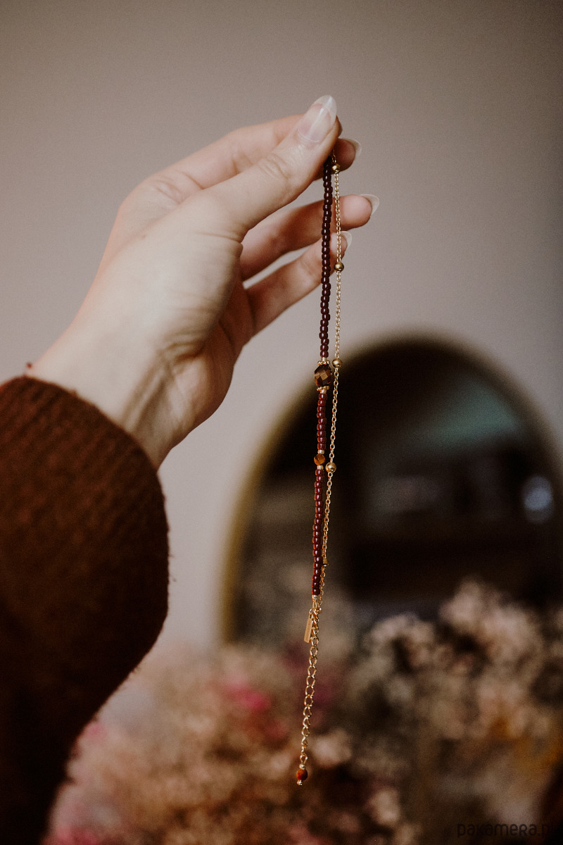 Listopadwóka inspirowana jest gorącym trendem AW2025 czyli czekoladowym brązem. Zyskał on miano nowej czerni, oferując głębię i elegancję w cieplejszym wydaniu. Otula nas i dodaje szyku. W centrum znajduje się pięknie ciosana bryłka tygrysiego oka. Bransoletka składa się również z łańcuszka, który dodaje jej warstwowości.