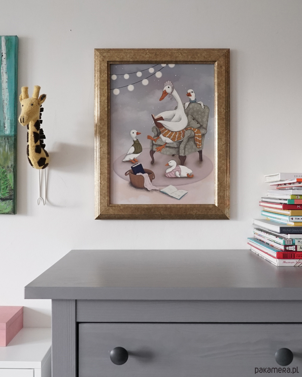 Ciepły plakat do pokoju dziecka. Mama GĄSKA razem ze swoimi dziećmi spędza czas czytając maluszkom ich ulubioną książkę. Miękki fotel, ciepły kocyk i dzieci...