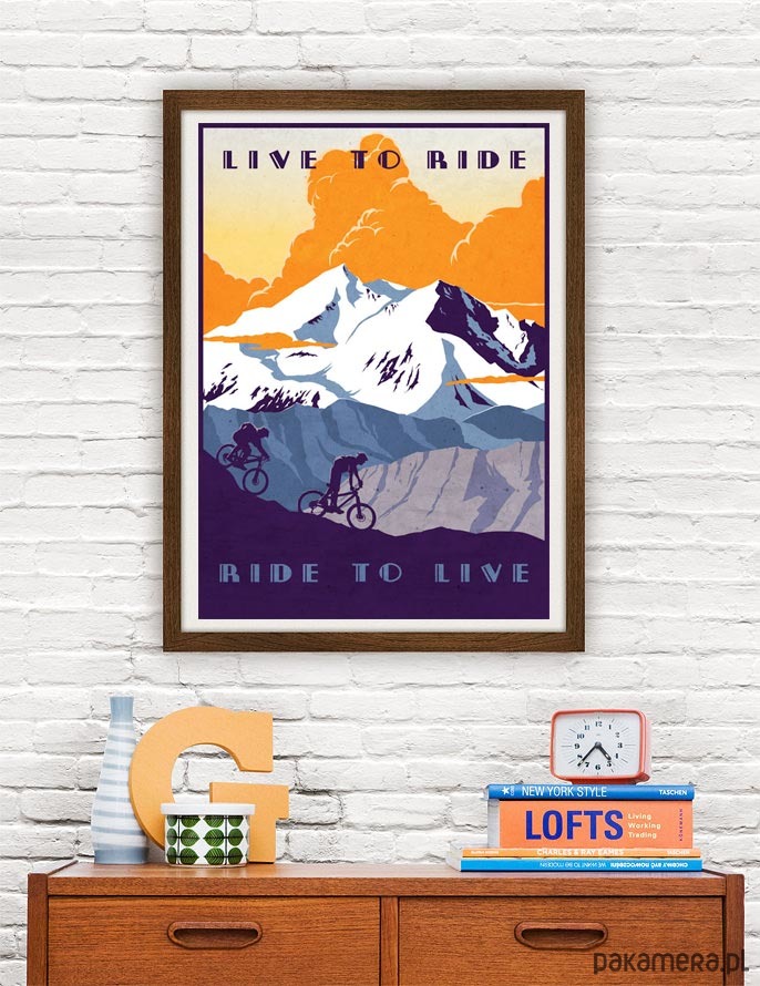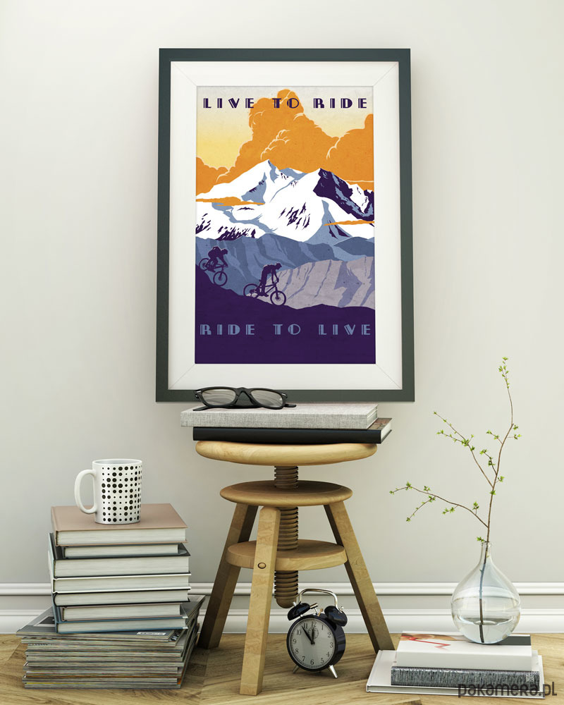Plakat w stylu vintage z autorską grafiką inspirowaną kolarstwem MTB. Przedstawia rowerzystów na tle ośnieżonych górskich przełęczy oraz napis "Live To Ride - Ride To Live". Inspirowany plakatami podróżniczymi z lat 20-tych XX wieku.