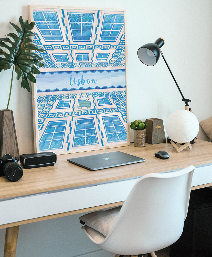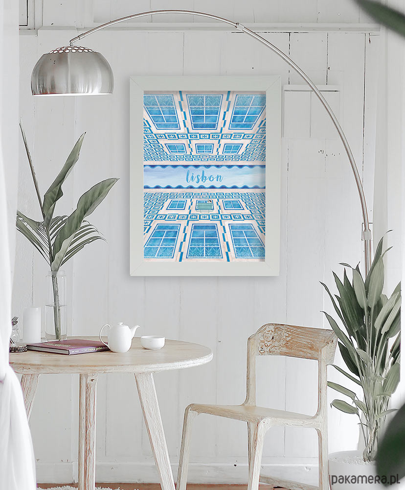 Plakat Lizbona wkrada się na jedną z uliczek portugalskiej stolicy, by podziwiać malownicze azulejos na fasadach kamienic. Na naszym plakacie dwie kamienice oglądane z dołu tworzą błękitne lustrzane odbicie. W jednym z okien kot przygląda się z zainteresowaniem widokowi z okna.
