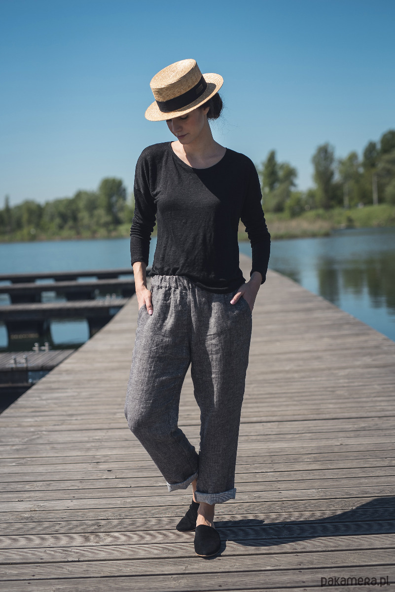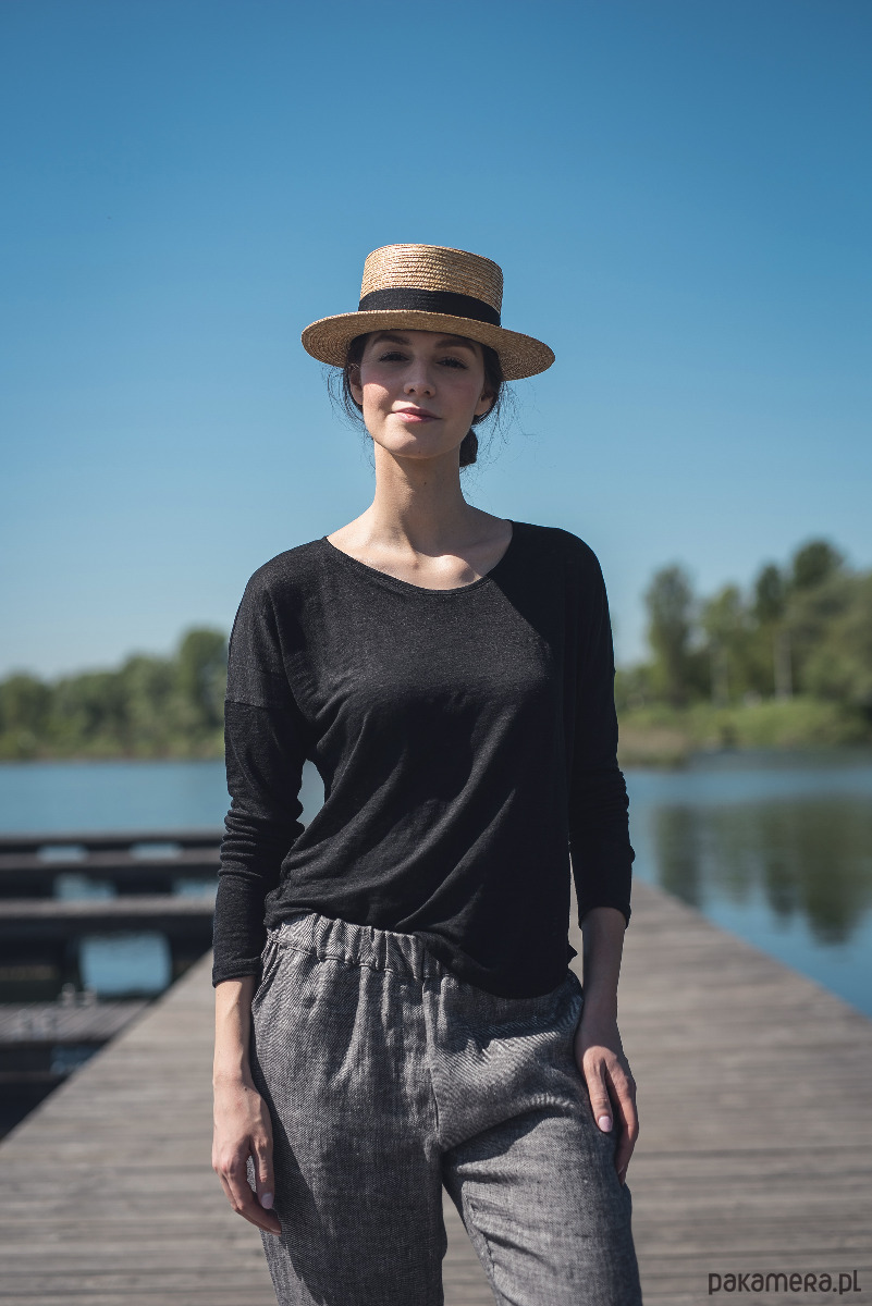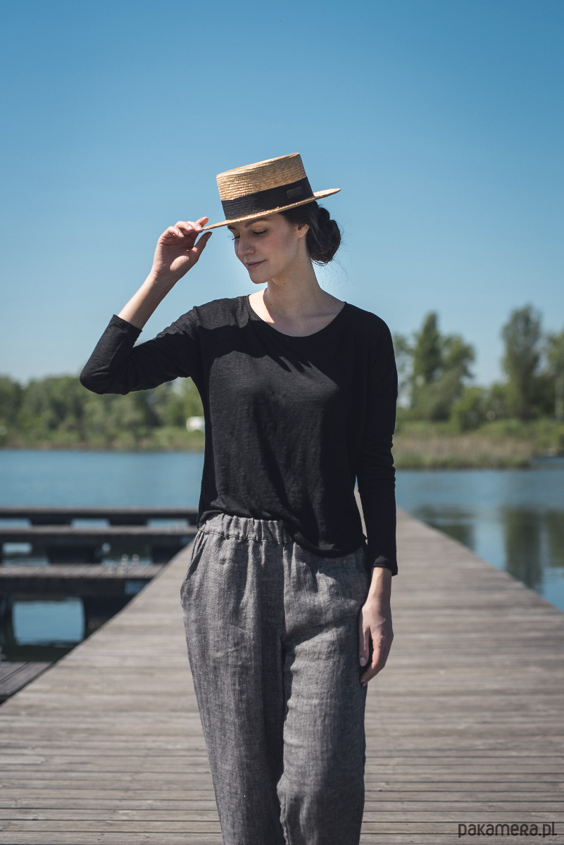 Lniana klasyczna bluzka dzianinowa z długim rękawem w kolorze czarnym. Pięknie dopasowuje się do ciała ponieważ została uszyta z 100% lnianej , specjalnie zmiękczanej dzianiny. Szczególnym detalem tej kolekcji jest specjalnie zaprojektowana metka, widoczna na ostatnim zdjęciu. To szczególne przesłanie dla moich klientek:)