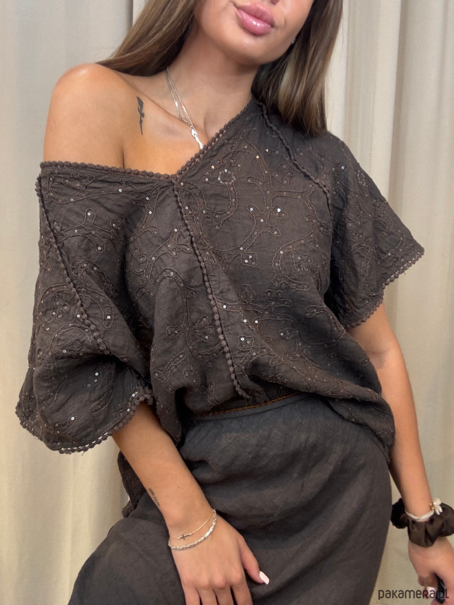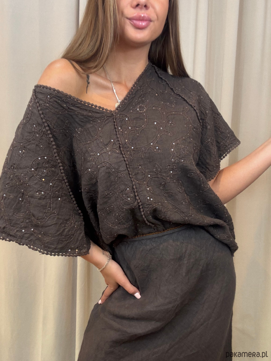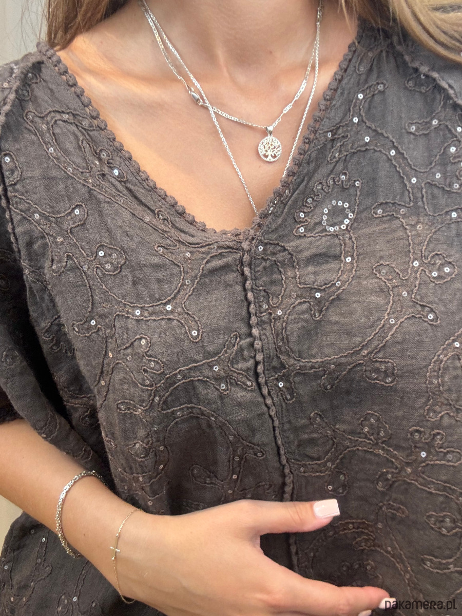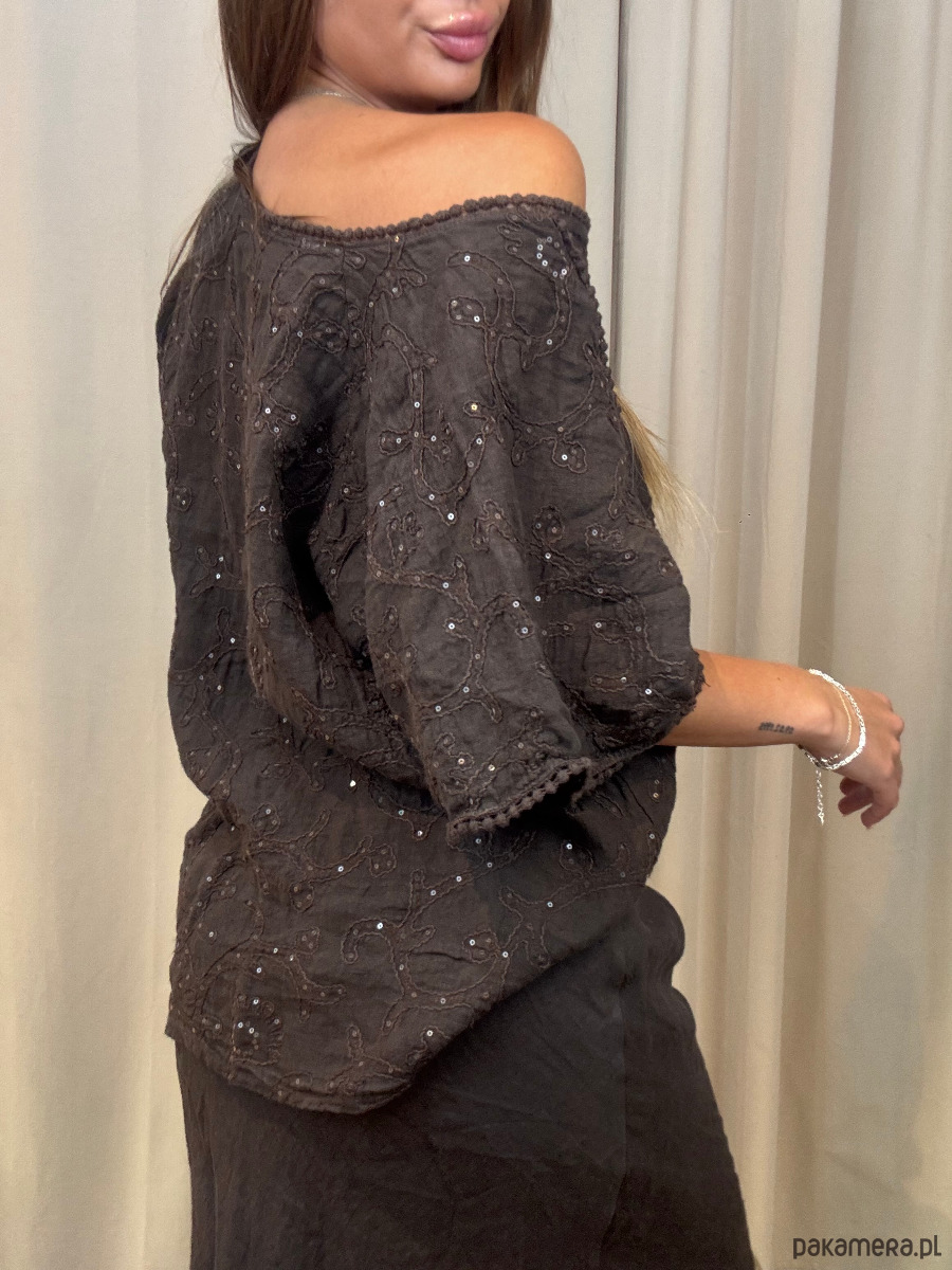 Lniana bluzka zdobiona cekinami i pomponikami.